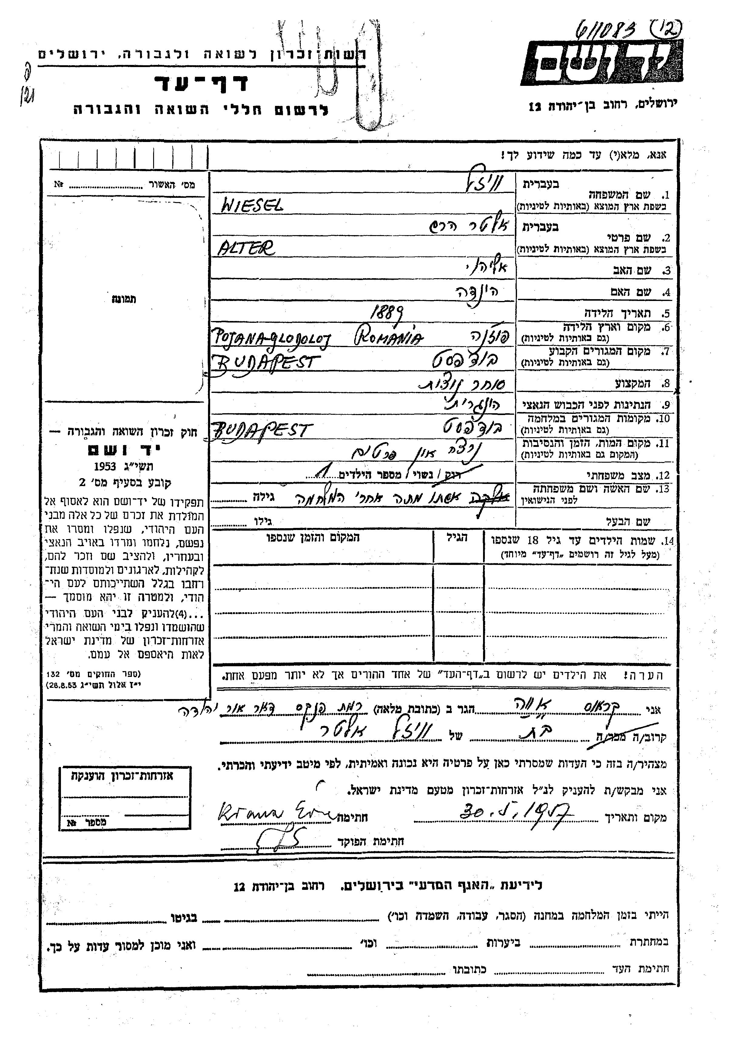 Wiesel Alter 1889 Budapest, Hongrie Feuille de témoignage