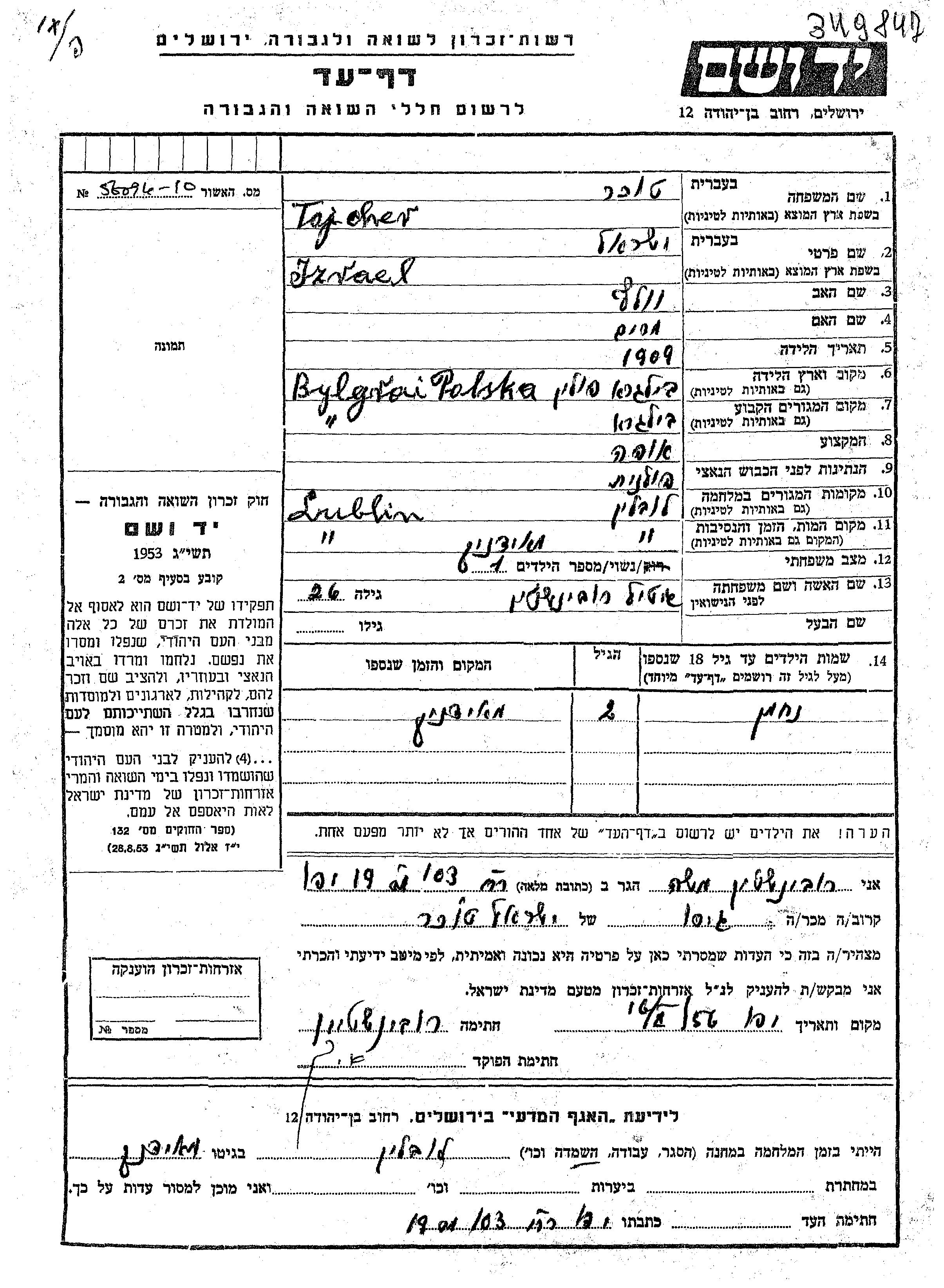 Tajcher Tukher Nakhman endroit inconnu, Feuille de témoignage