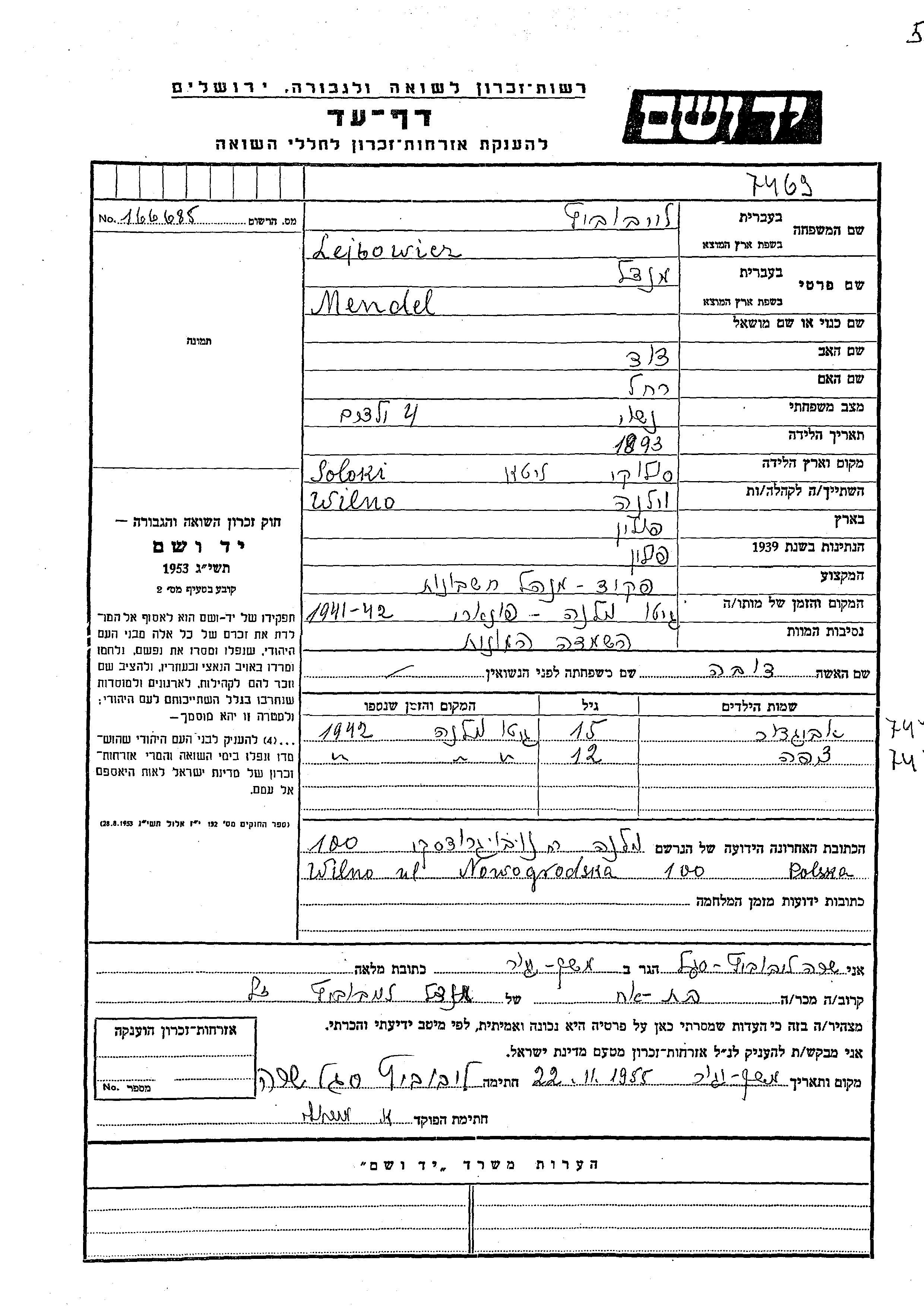 Lejbowicz Avigdor Pologne Feuille de témoignage