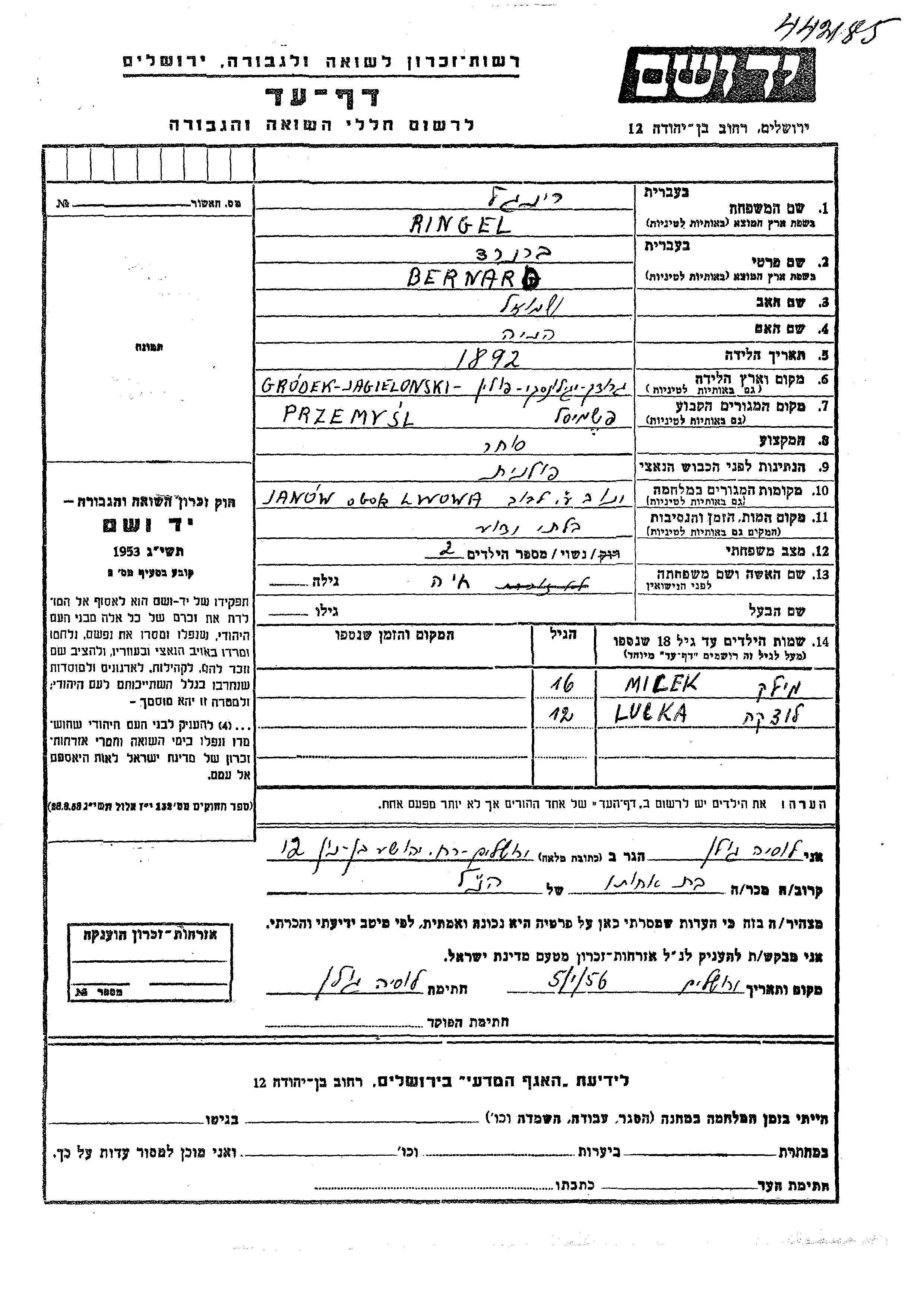 Ringel Milek Przemysl, Pologne Feuille de témoignage