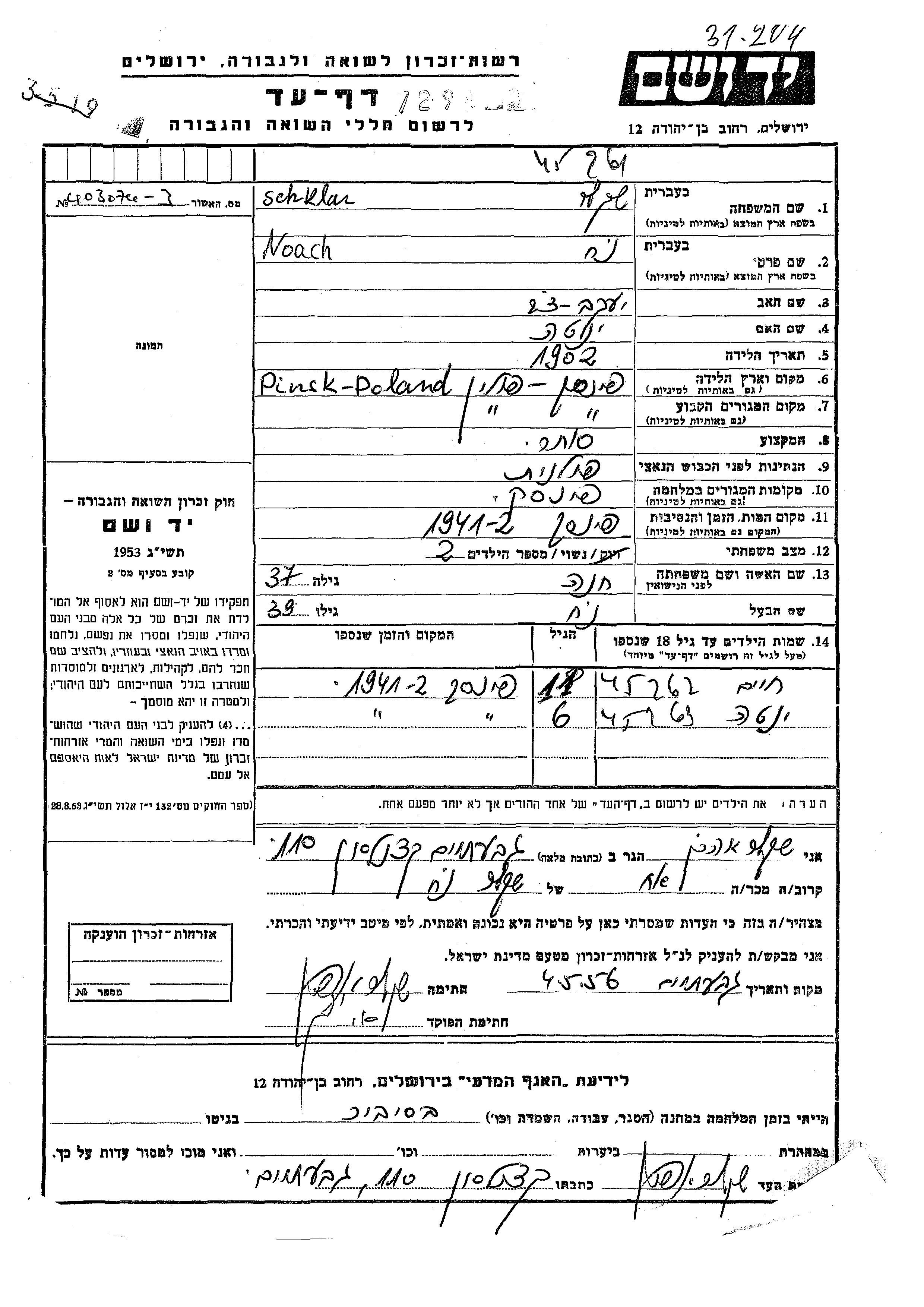 Schklar Yenta Pinsk, Pologne Feuille de témoignage