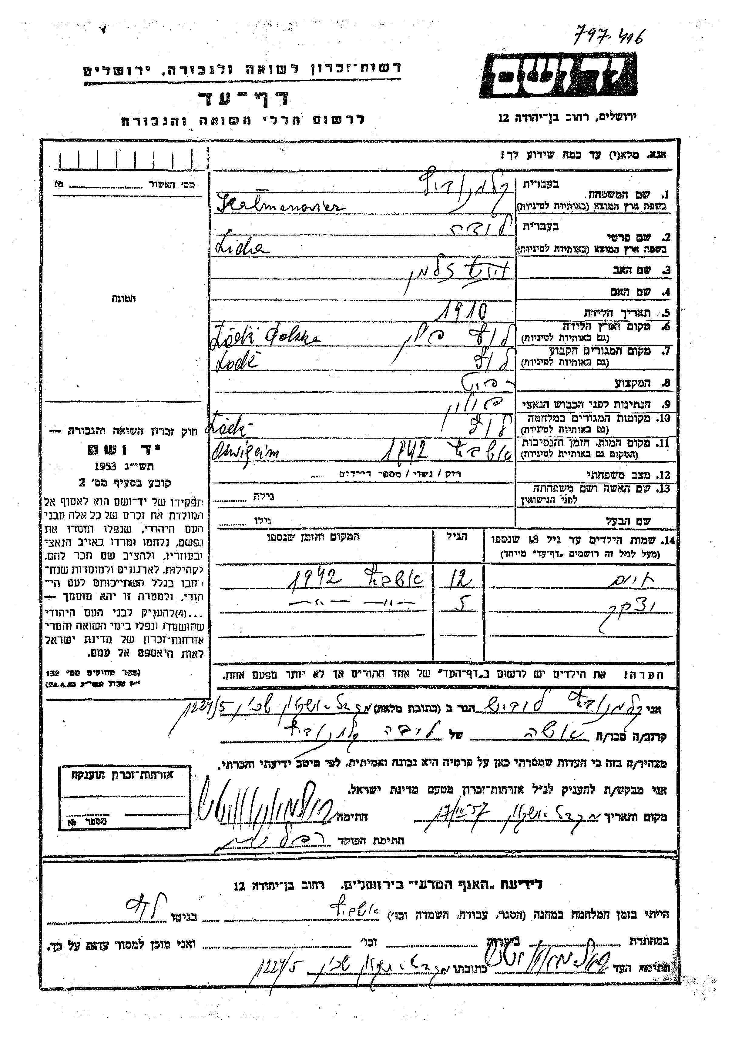 Yad Vashem - Pages of Testimony Names Memorial Collection