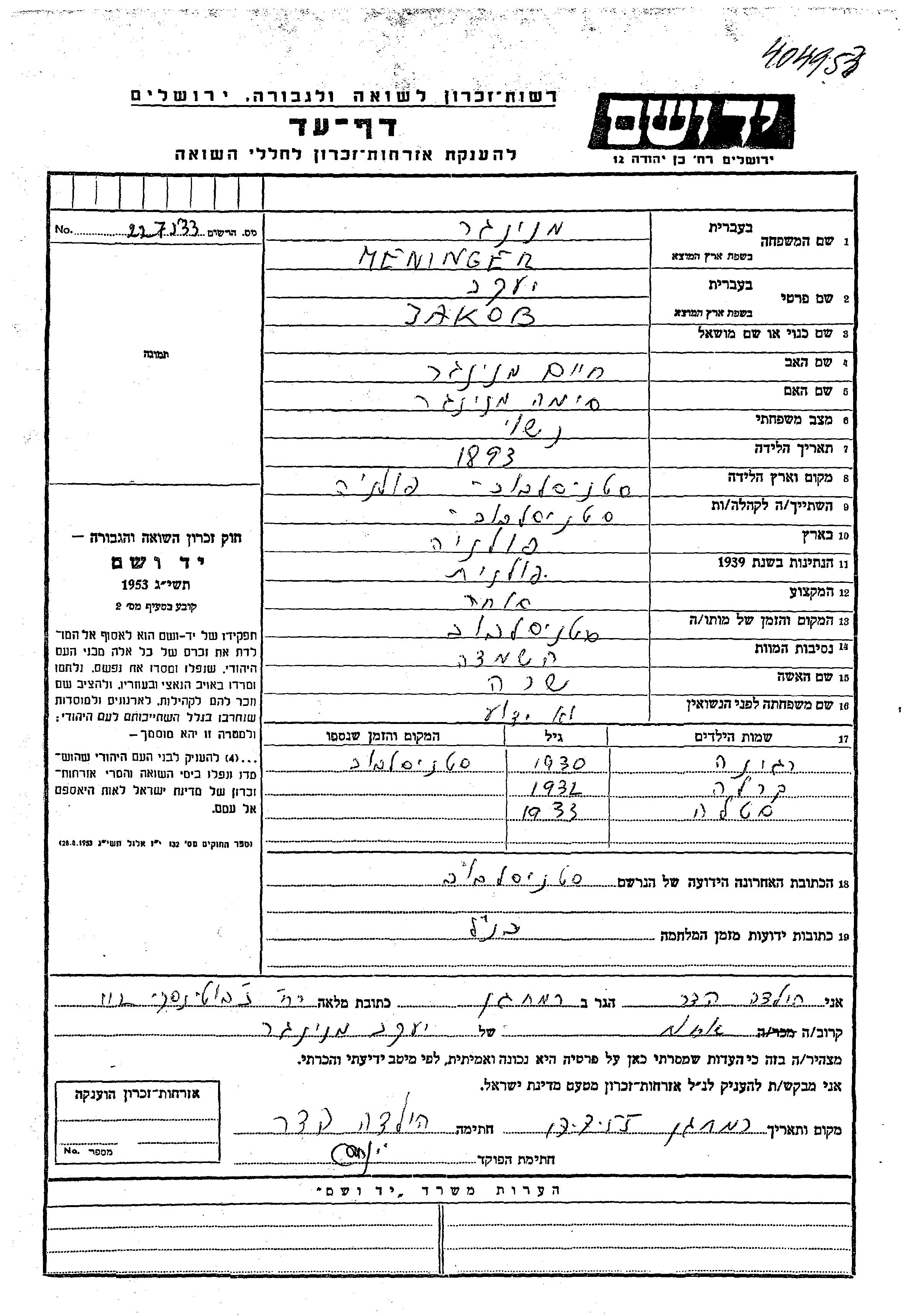 Meninger Regina 1930 Stanislawow, Pologne Feuille de témoignage