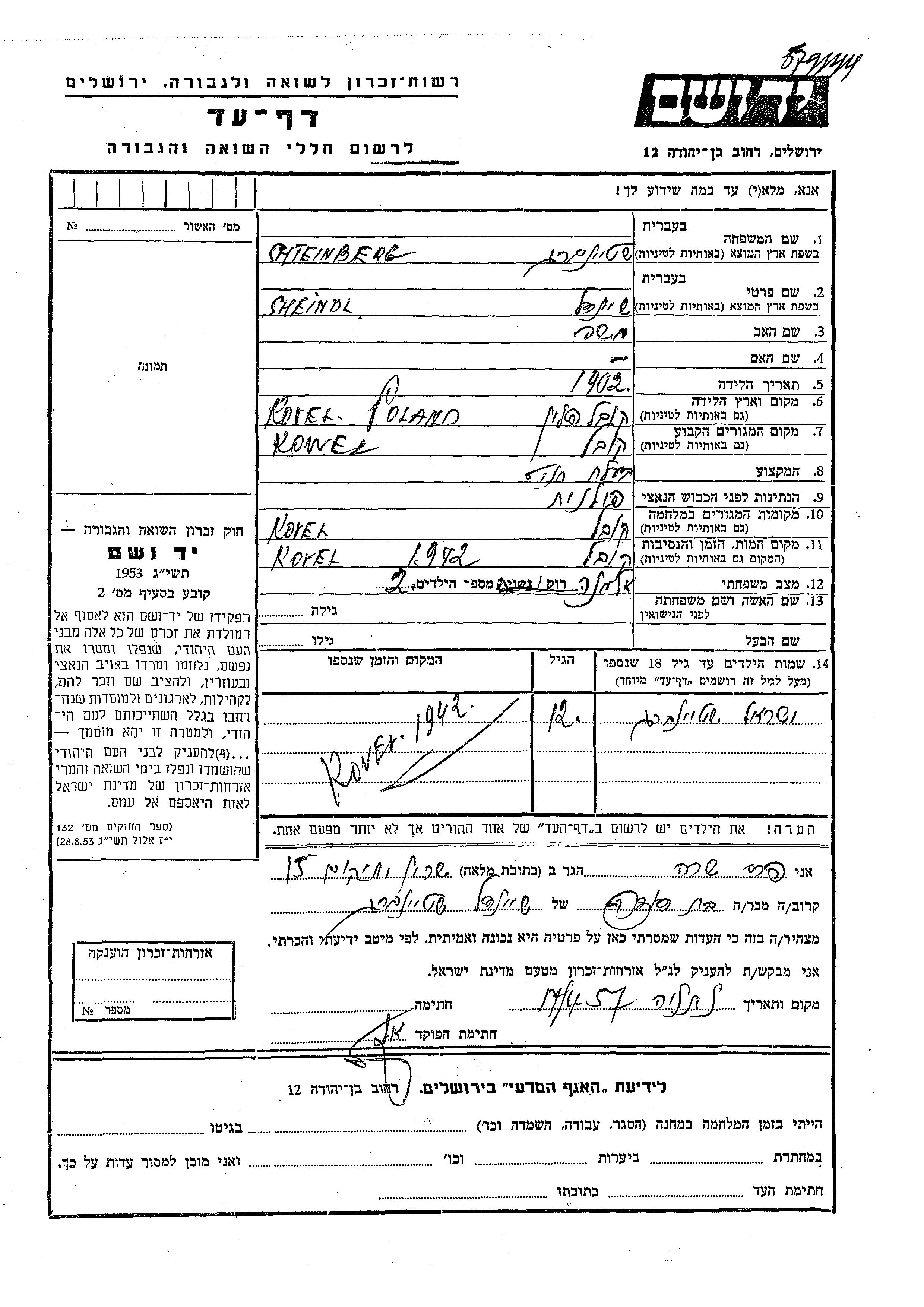 Yisrael Shteinberg est né fils de Sheindl. Il était Enfant. Avant la seconde guerre mondiale il vivait à Kowel, Pologne. Au cours de la guerre, il était à Kowel, Pologne.