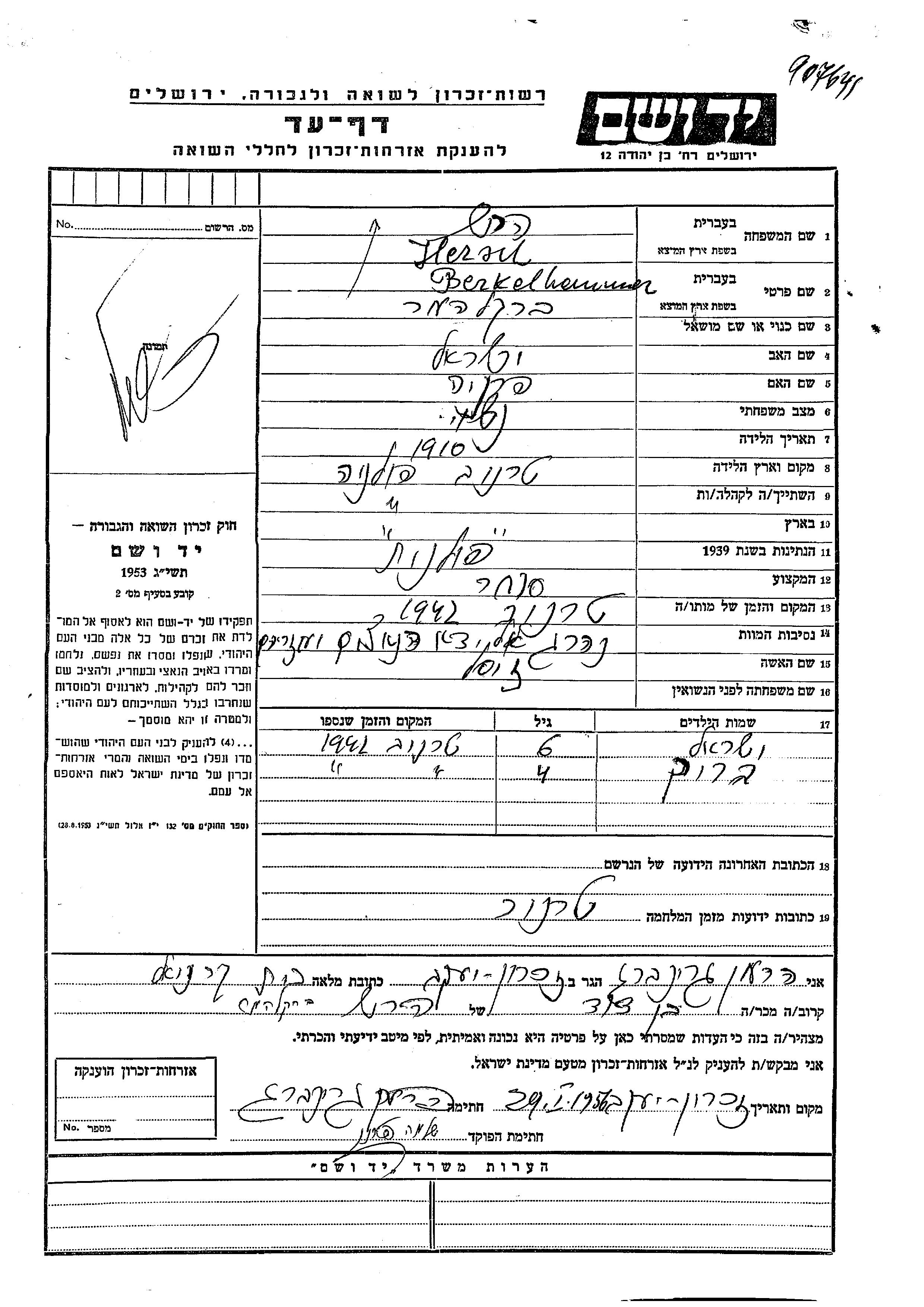 Berkelhammer Barukh Tarnow, Pologne Feuille de témoignage