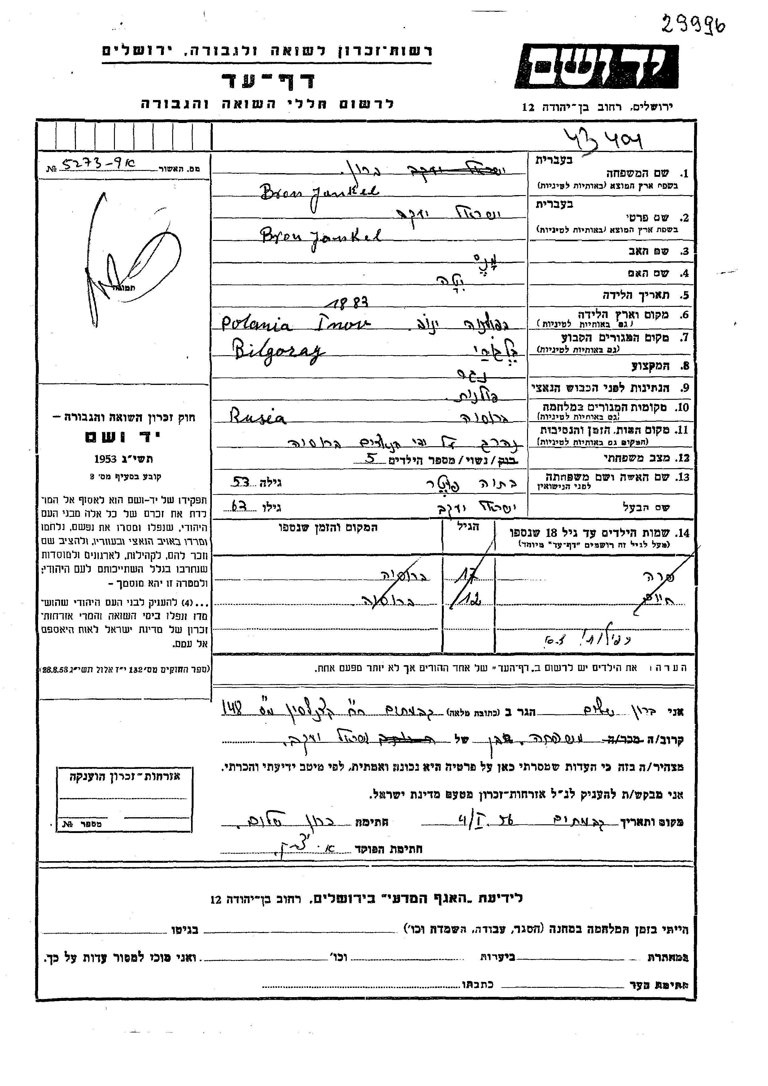 Yad Vashem - Pages of Testimony Names Memorial Collection