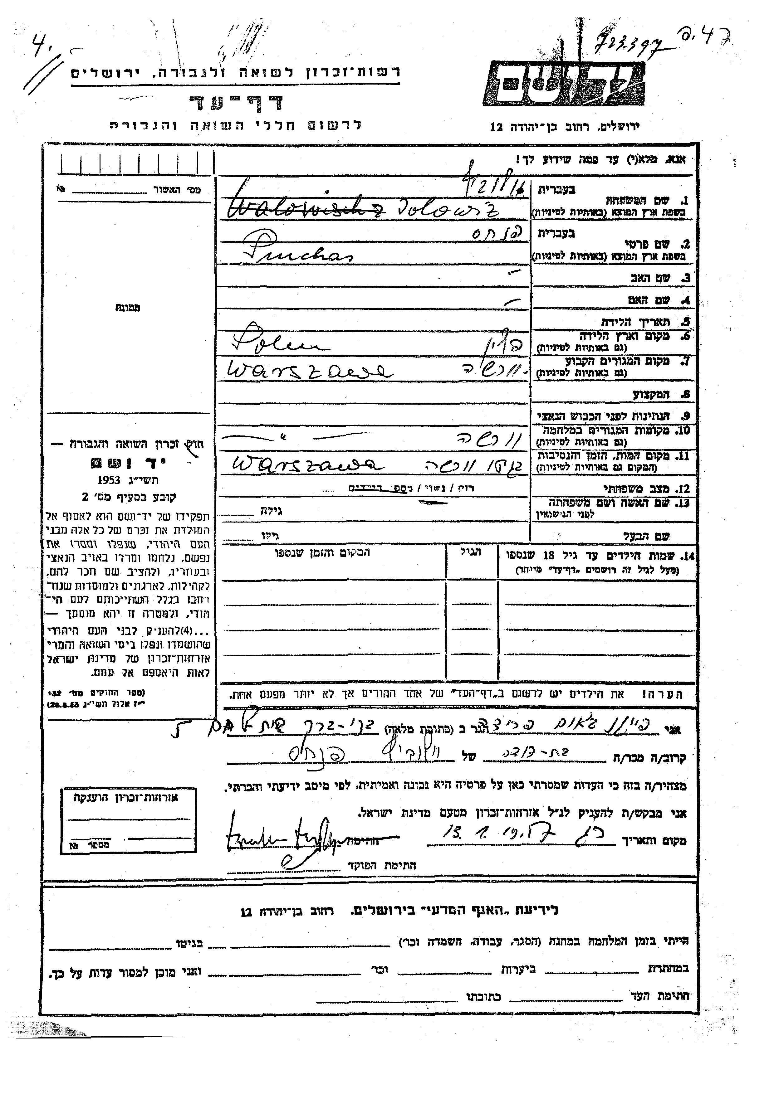 Jolowiz Pinchas Warsaw, Pologne Feuille de témoignage