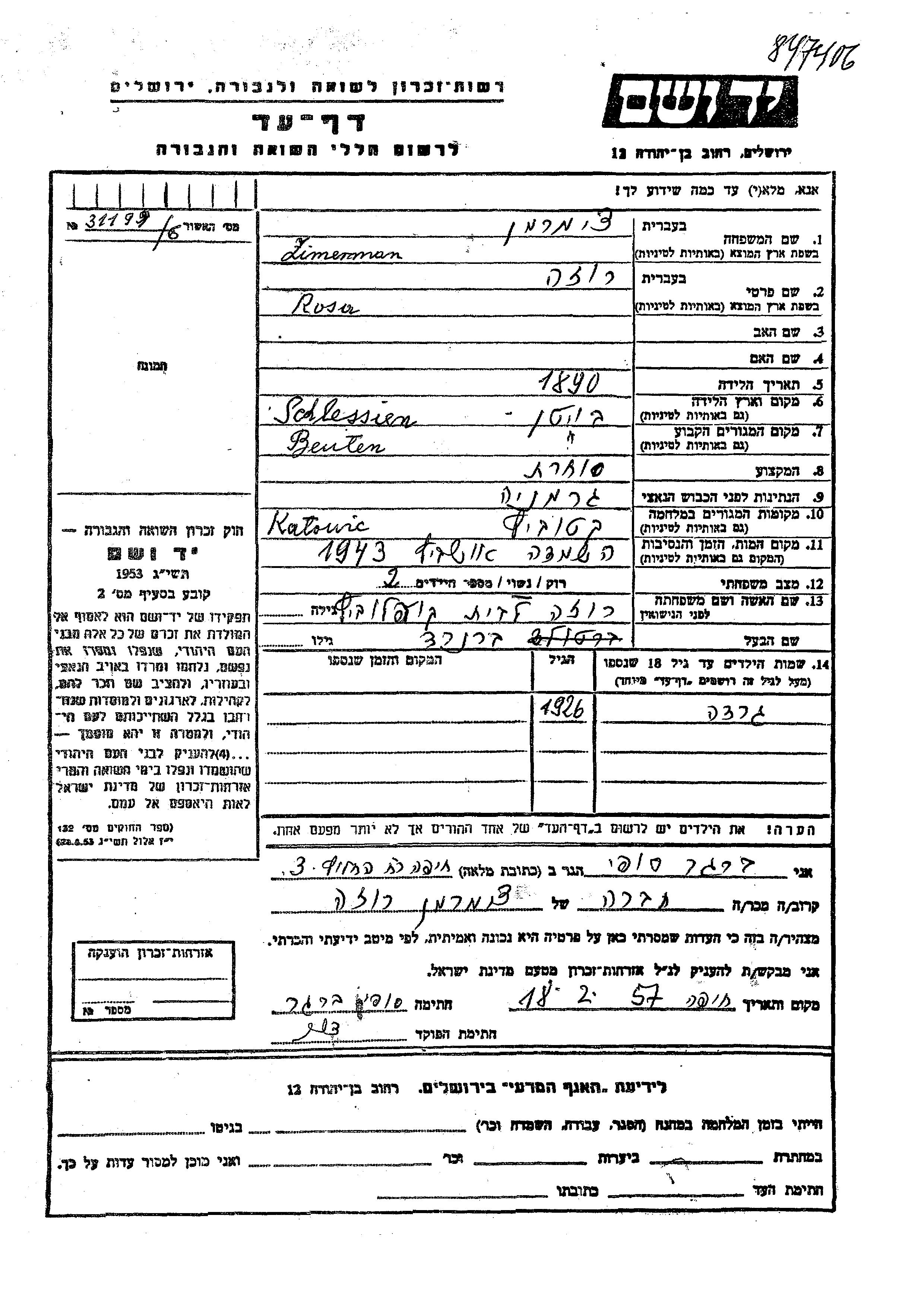 Zimerman Tzimerman Gerda 1926 Beuthen, Allemagne Feuille de témoignage
