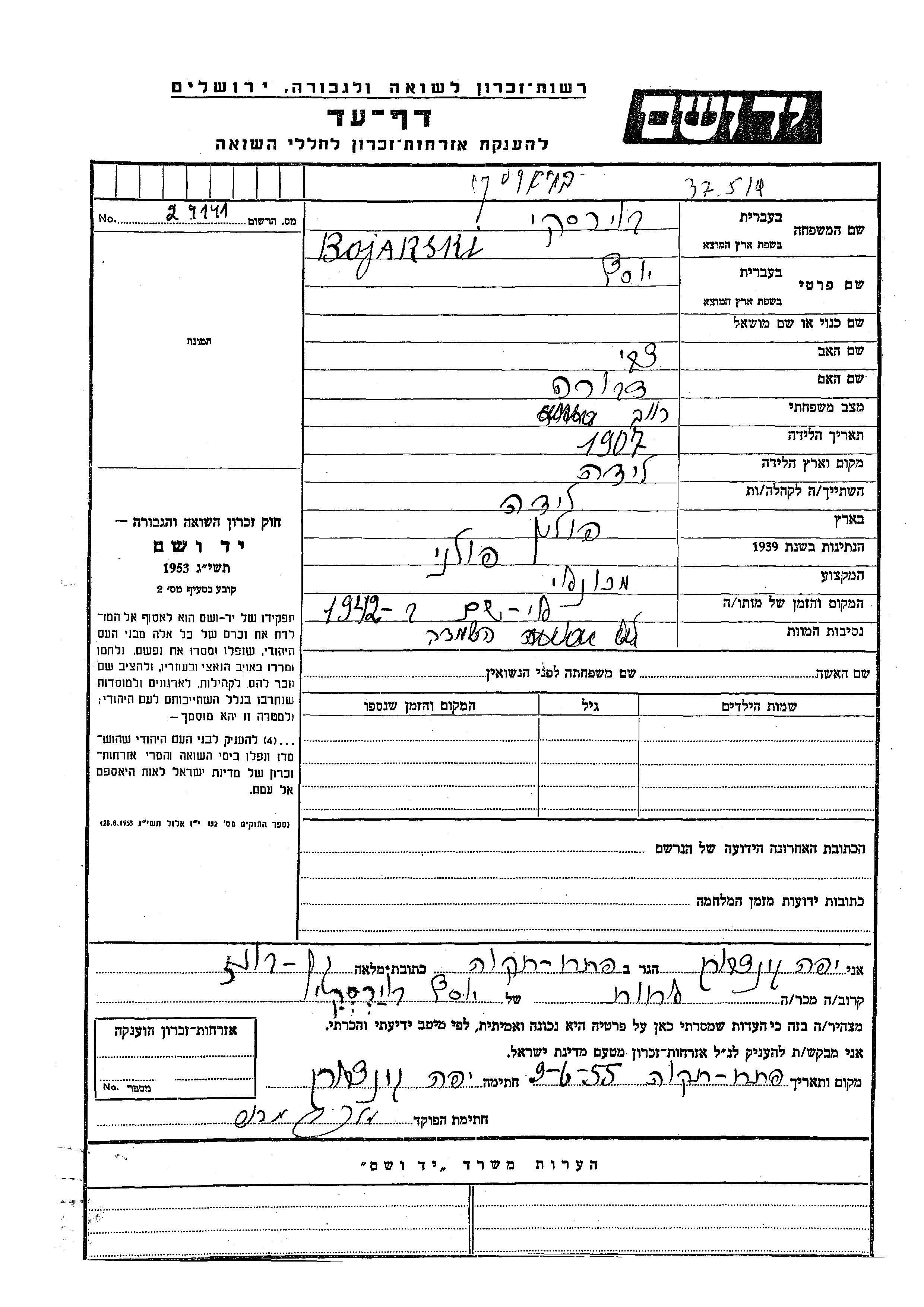 Bojarski Yosef 1907 Lida, Pologne Feuille de témoignage