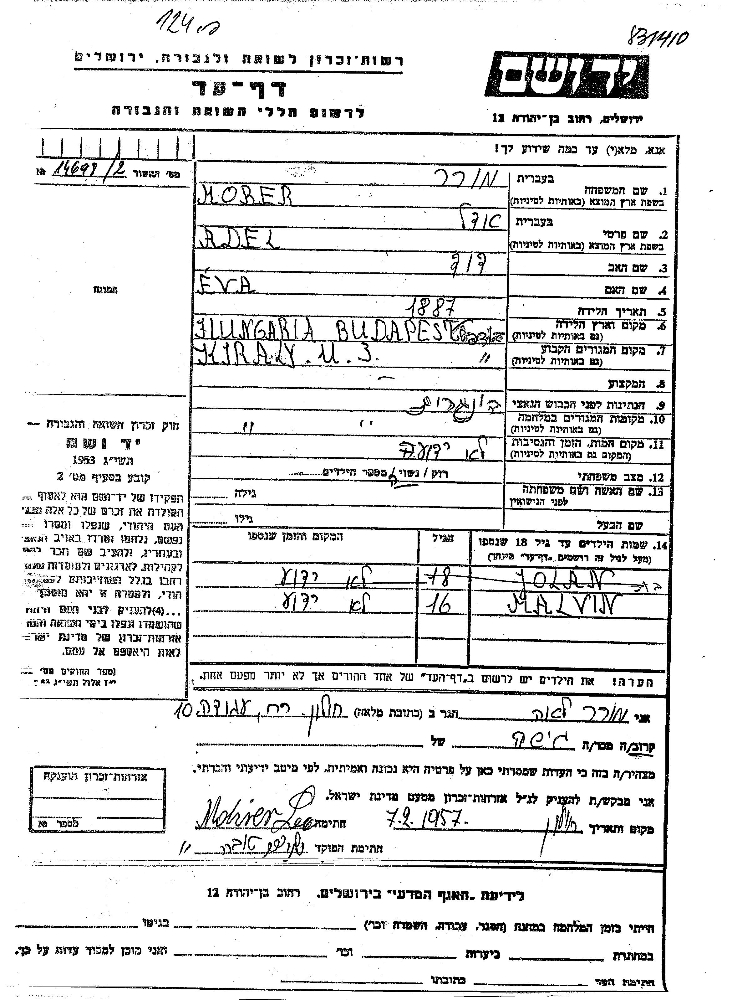 Morer Yolan Budapest, Hongrie Feuille de témoignage