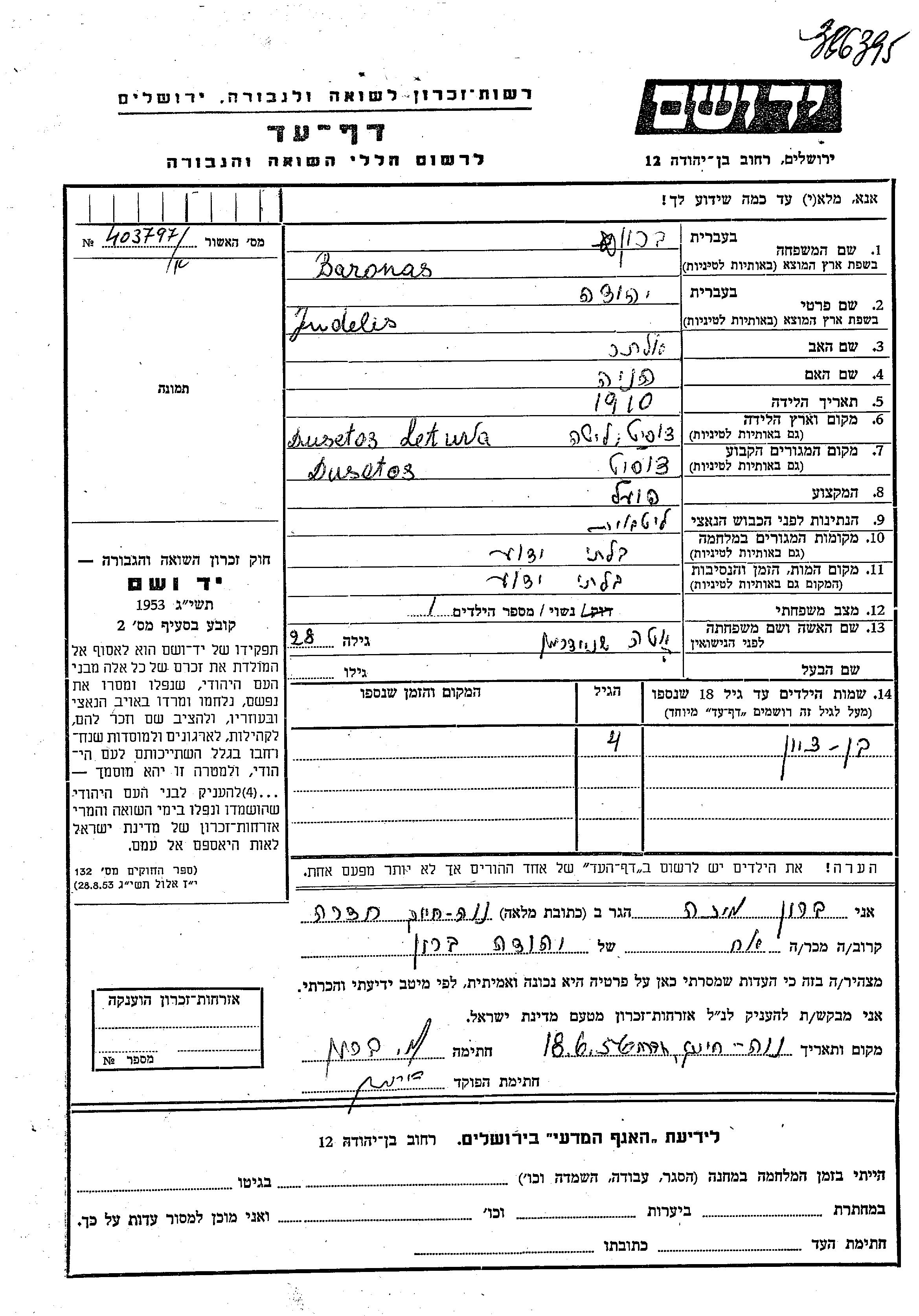 Bentzion Baronas est né fils de Judelis et de Eta née Shneiderman. Il était Enfant. Avant la seconde guerre mondiale il vivait à Dusetos, Lituanie.