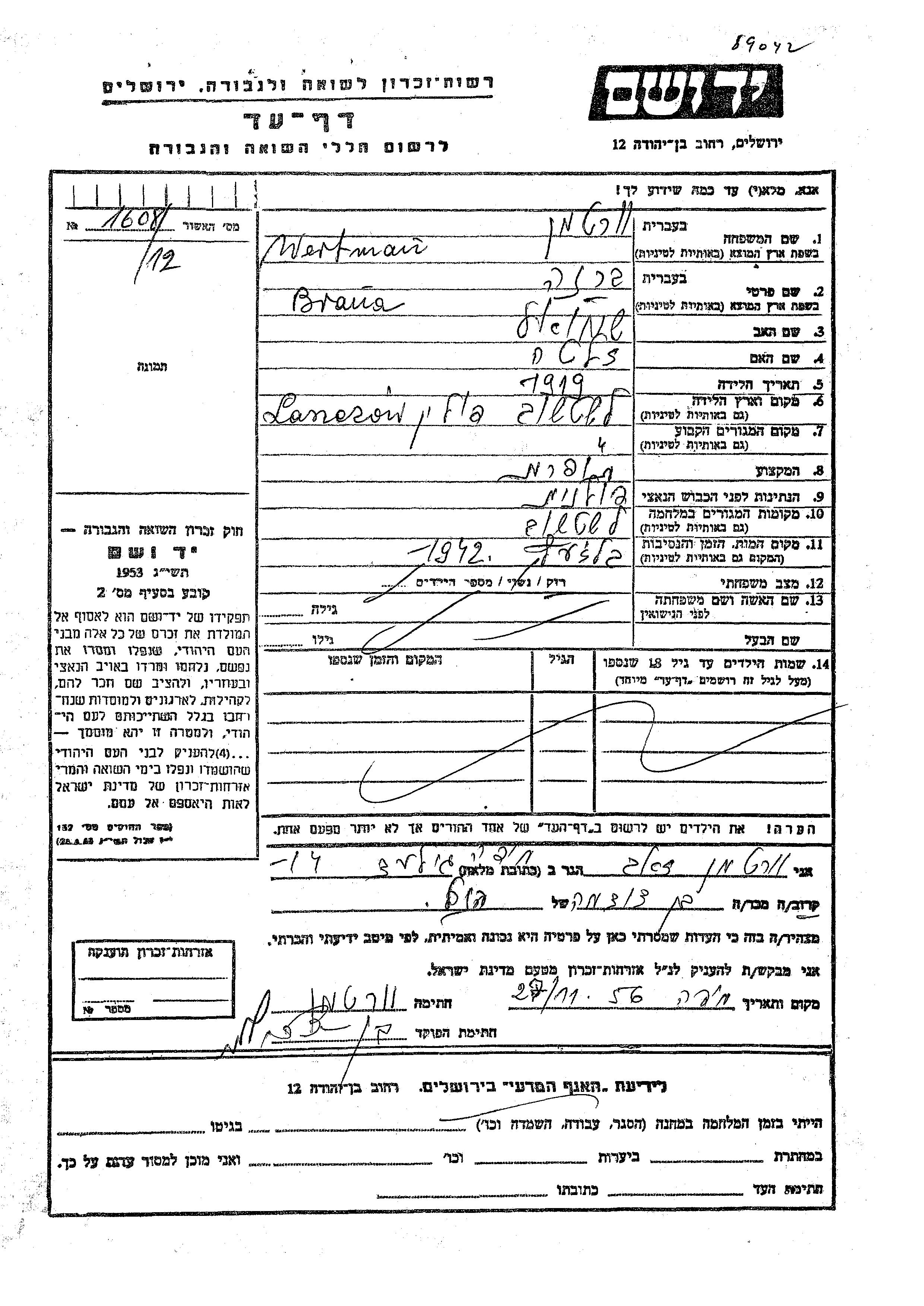 Wertman Vurtman Brana 1919 Laszczow, Pologne Feuille de témoignage