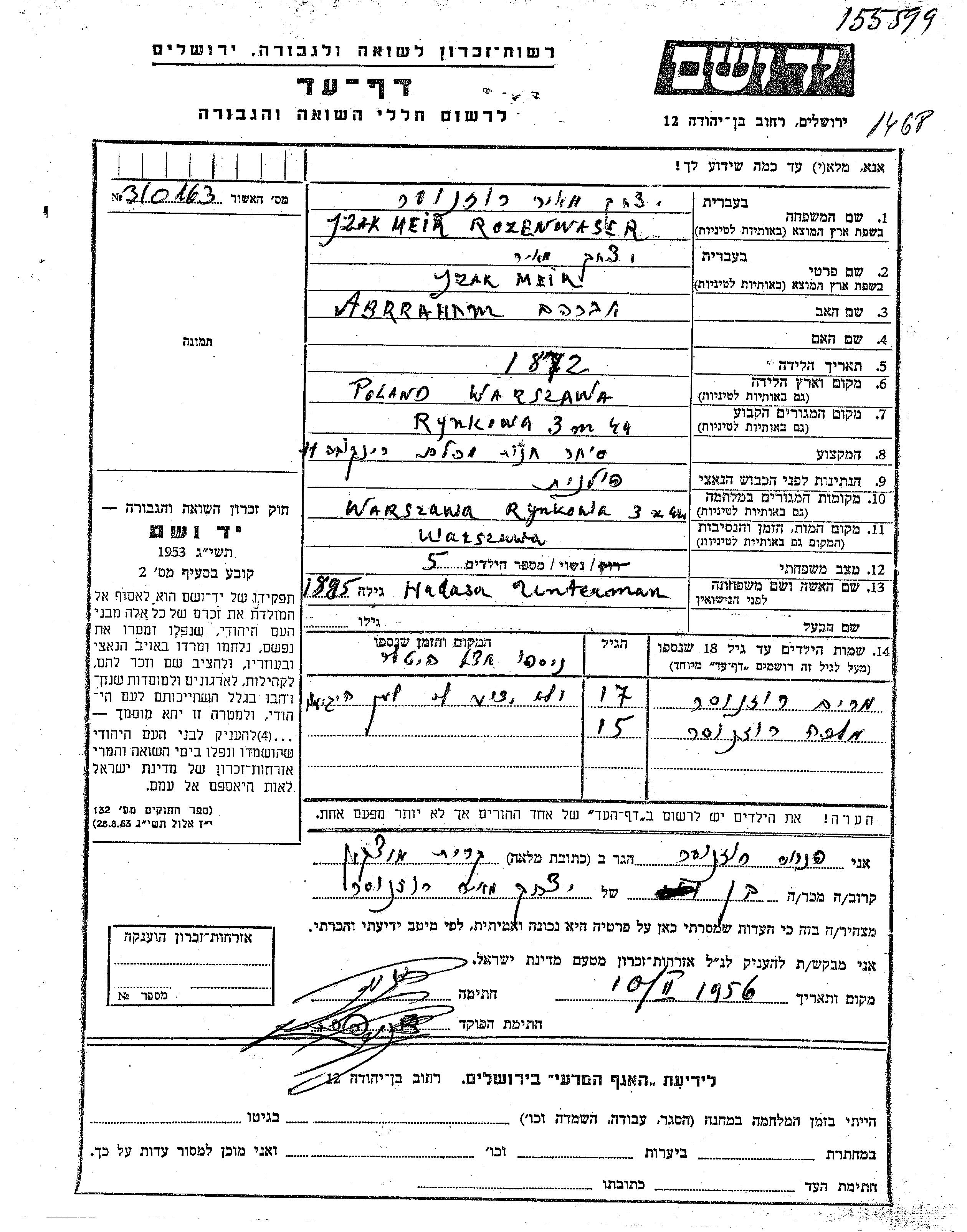 Rozenwaser Miriam Warszawa, Pologne Feuille de témoignage