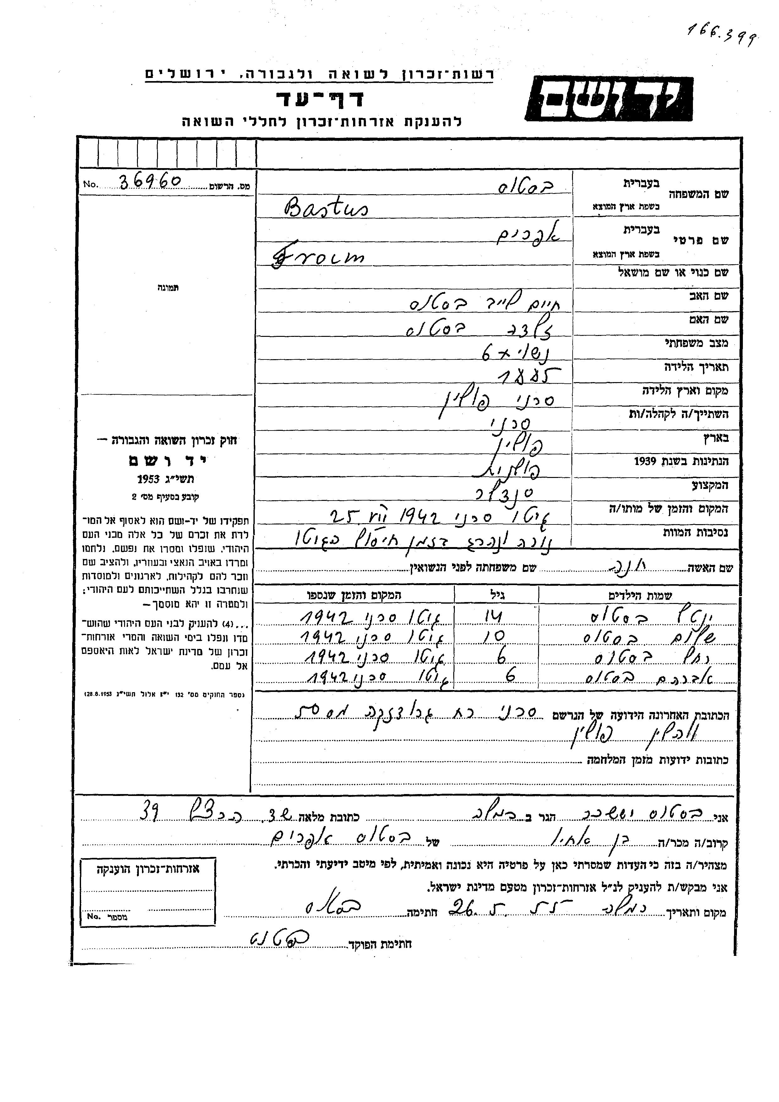 Bastus Yentl Sarny, Pologne Feuille de témoignage