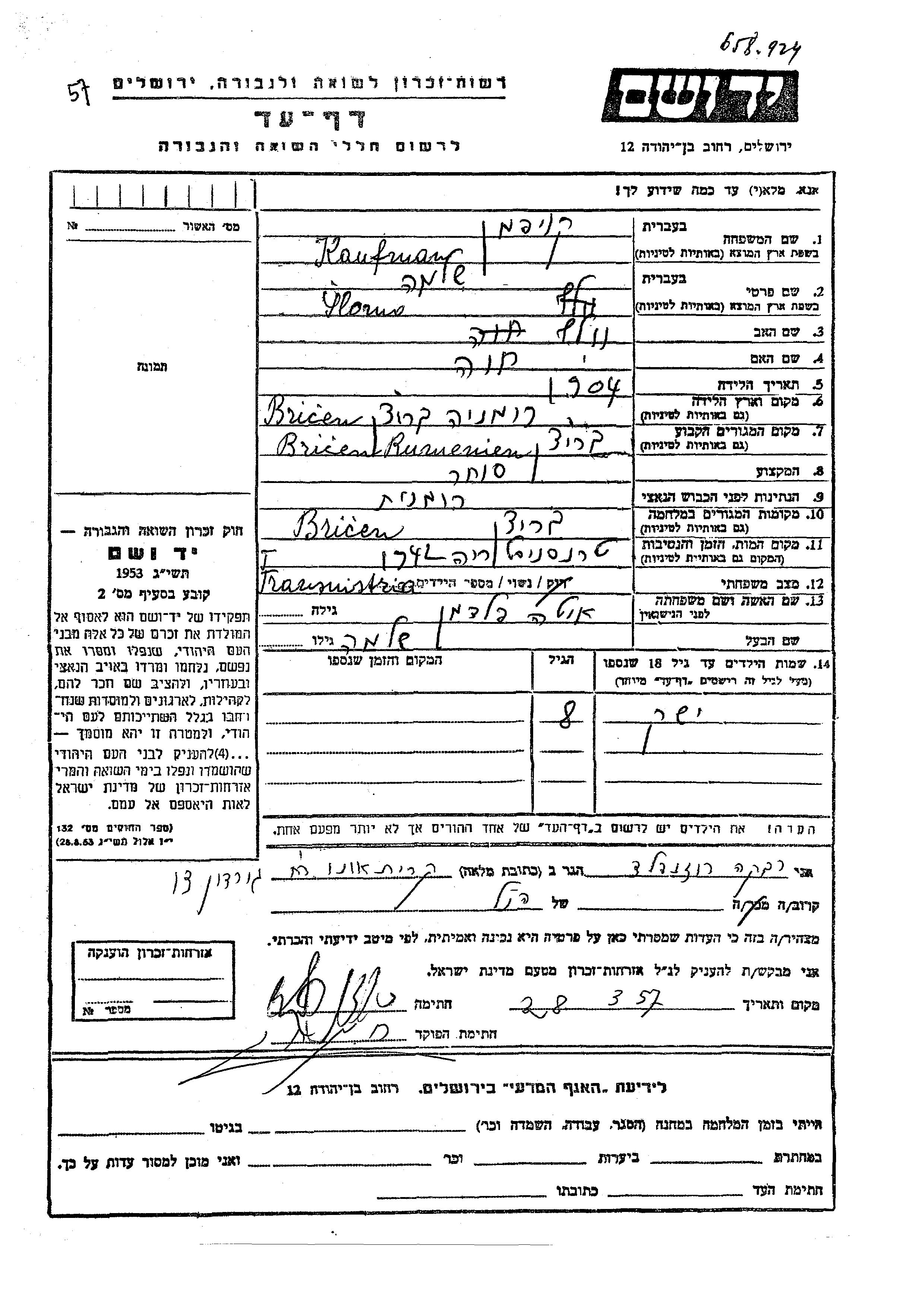 Kaufman Iashek Briceni Sat, Roumanie Feuille de témoignage