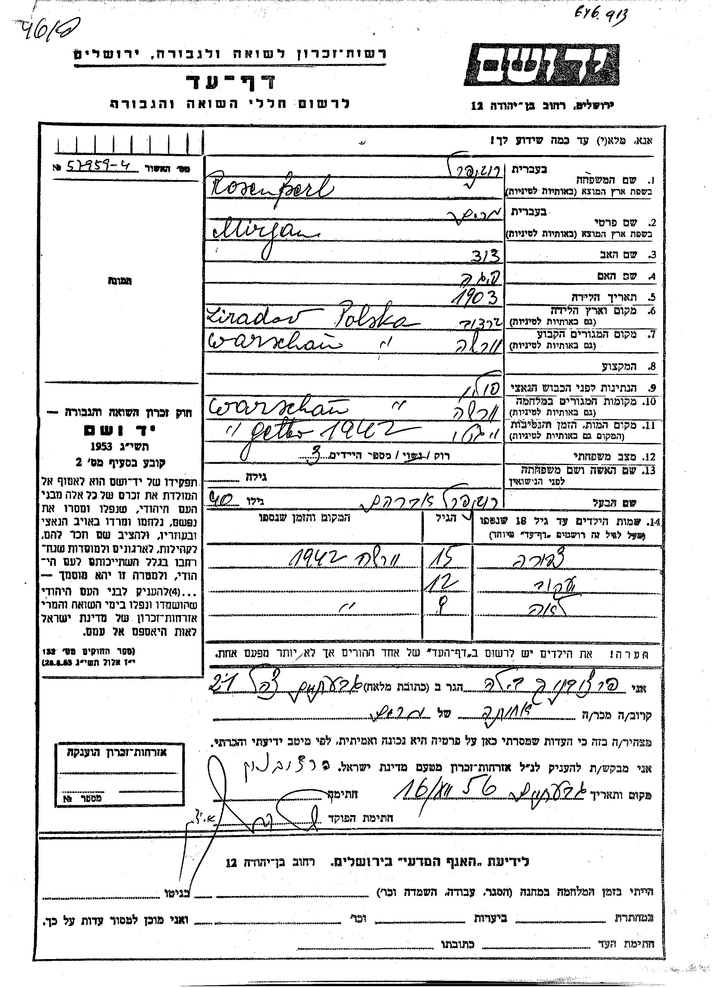 Rosenperl Tzipora Warszawa, Pologne Feuille de témoignage