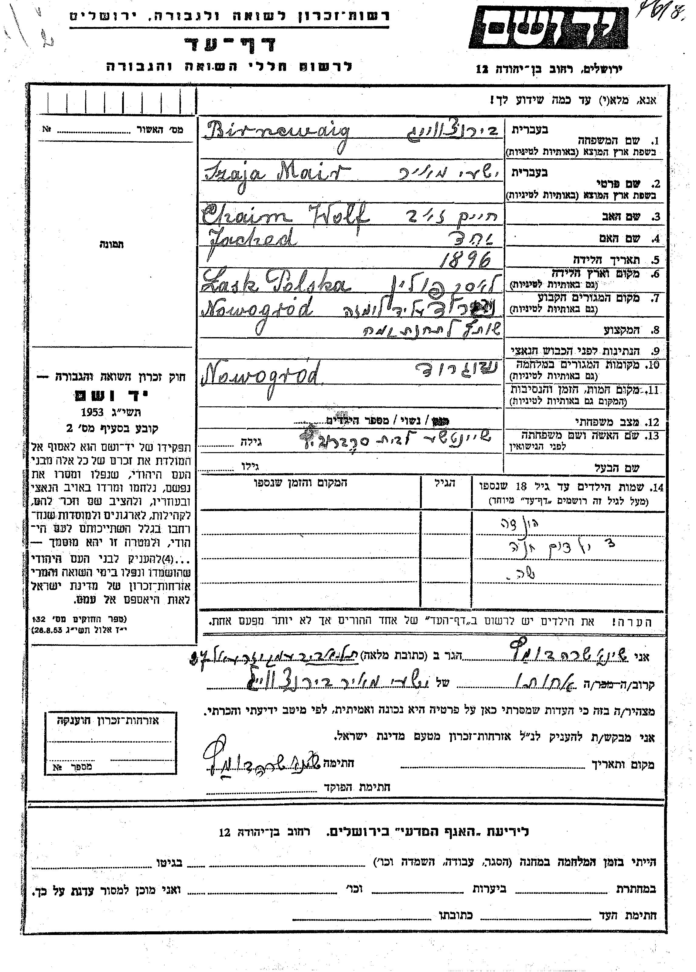 Birncwaig Hinda Nowogrod, Pologne Feuille de témoignage