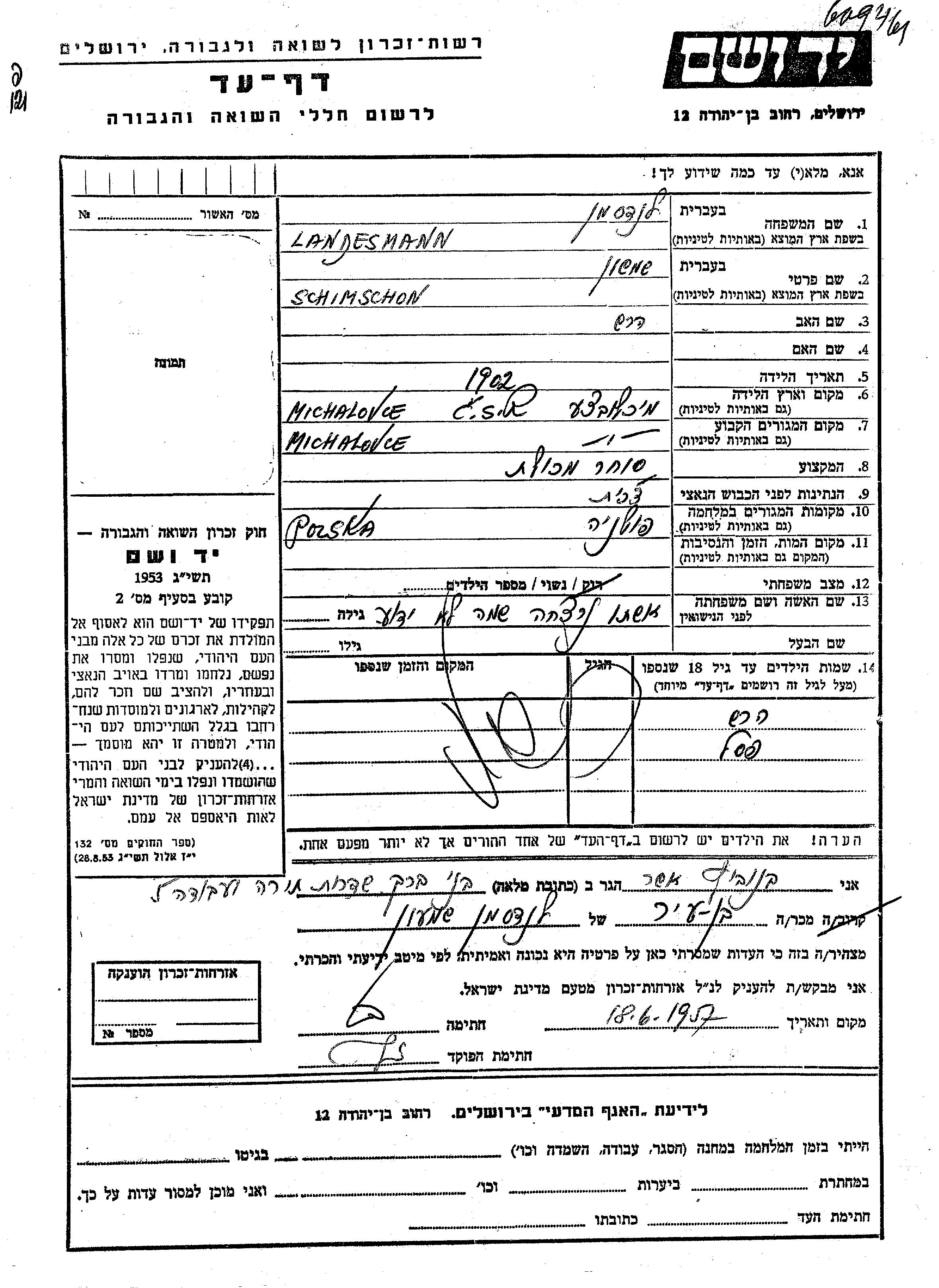 Landesmann Hersh Michalovce, Tchécoslovaquie Feuille de témoignage