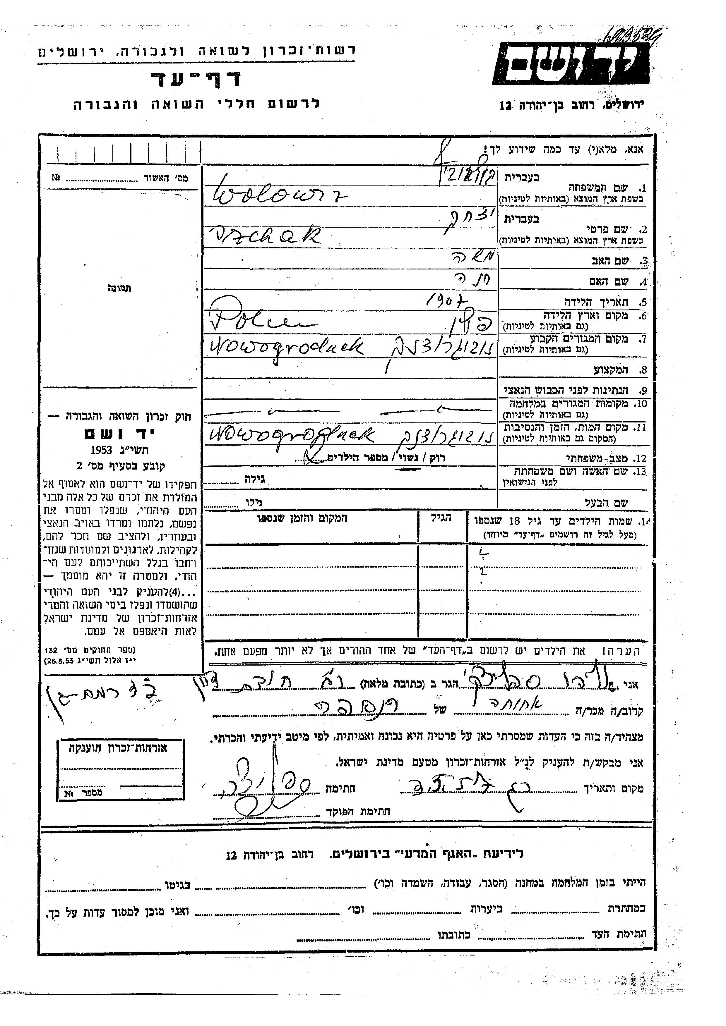 Wolowsz Izchak 1907 Nowogrodek, Pologne Feuille de témoignage