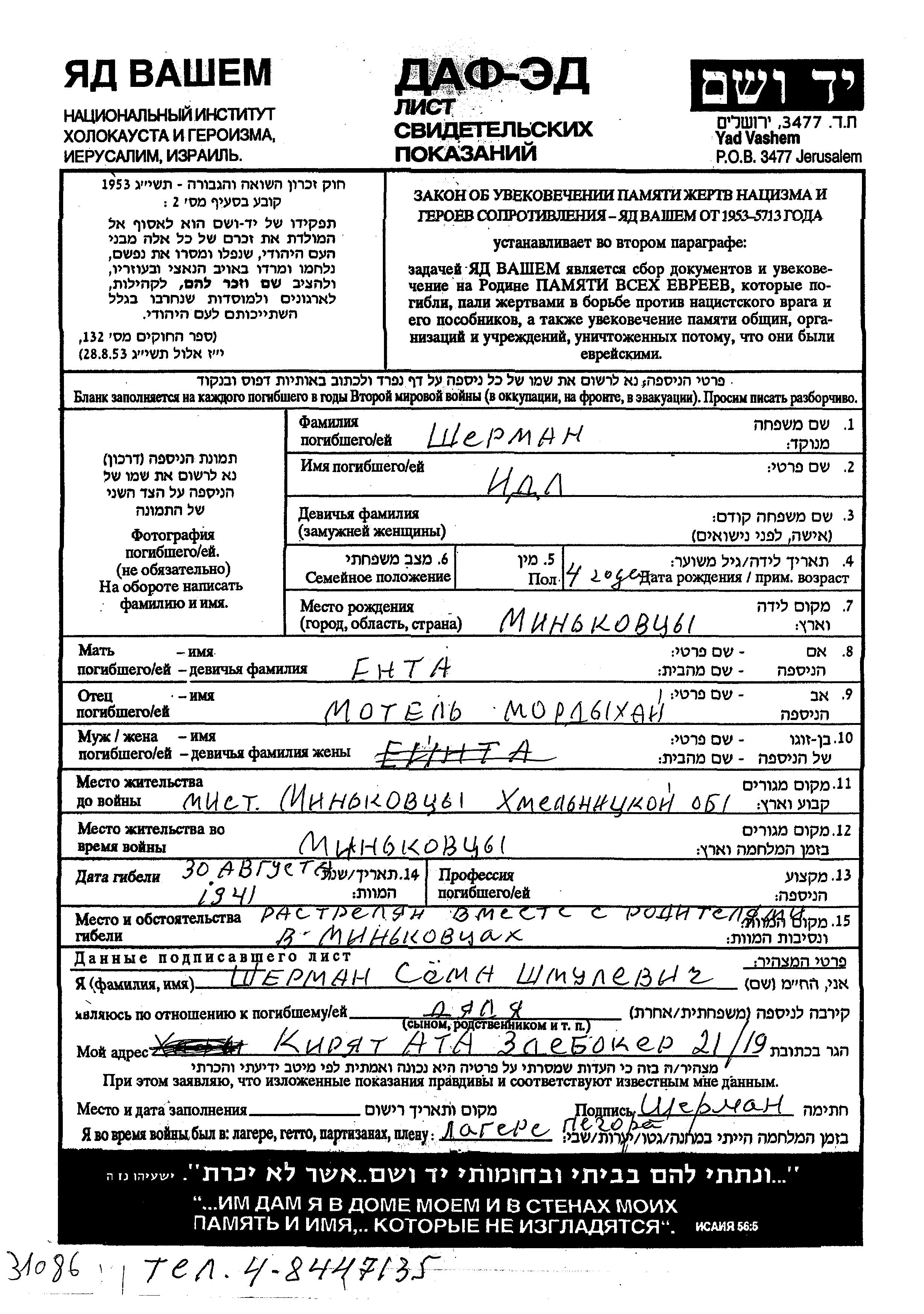 Sherman Idl Minkovitz, Ukraine (URSS) Feuille de témoignage