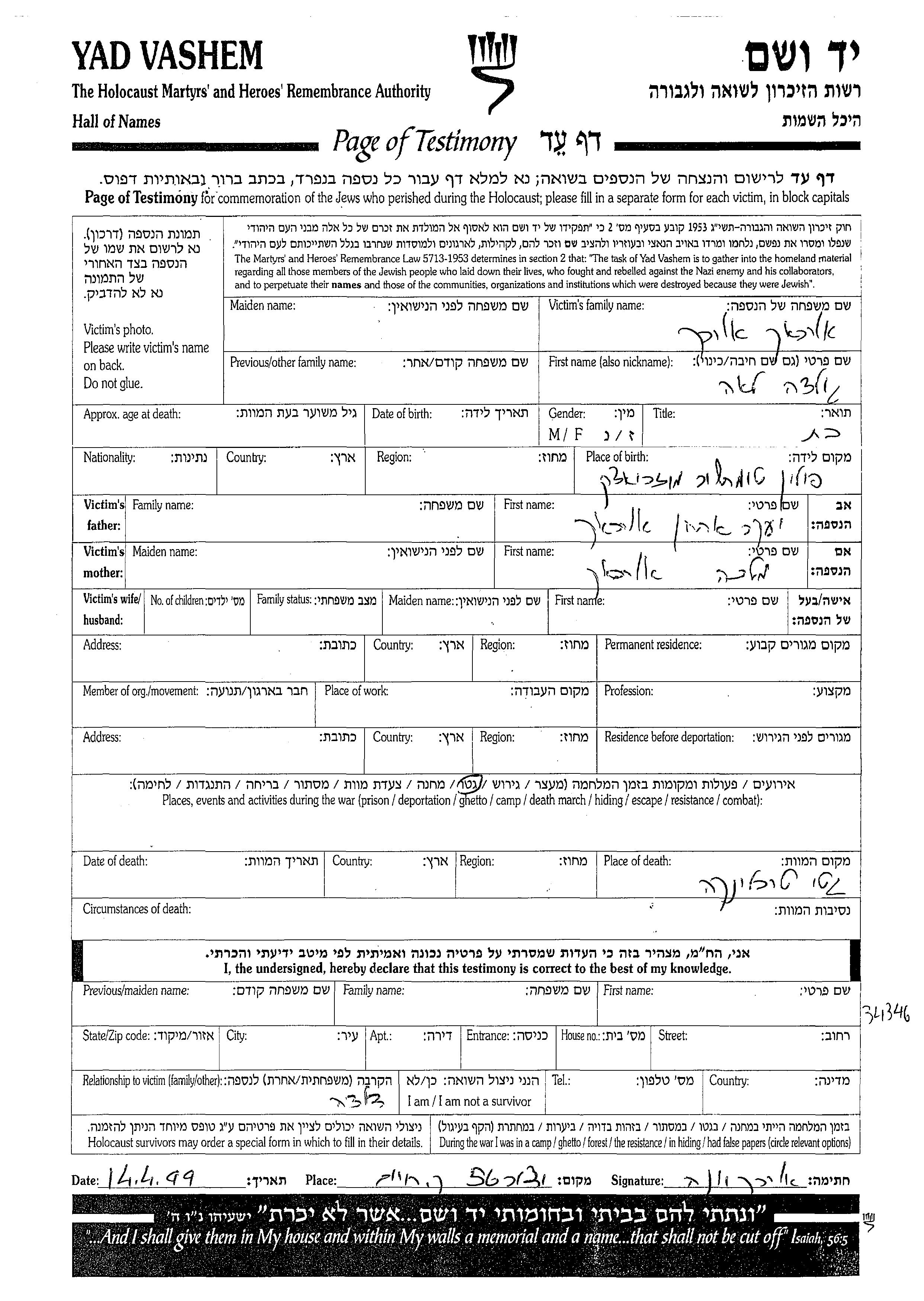 Yad Vashem - Pages of Testimony Names Memorial Collection