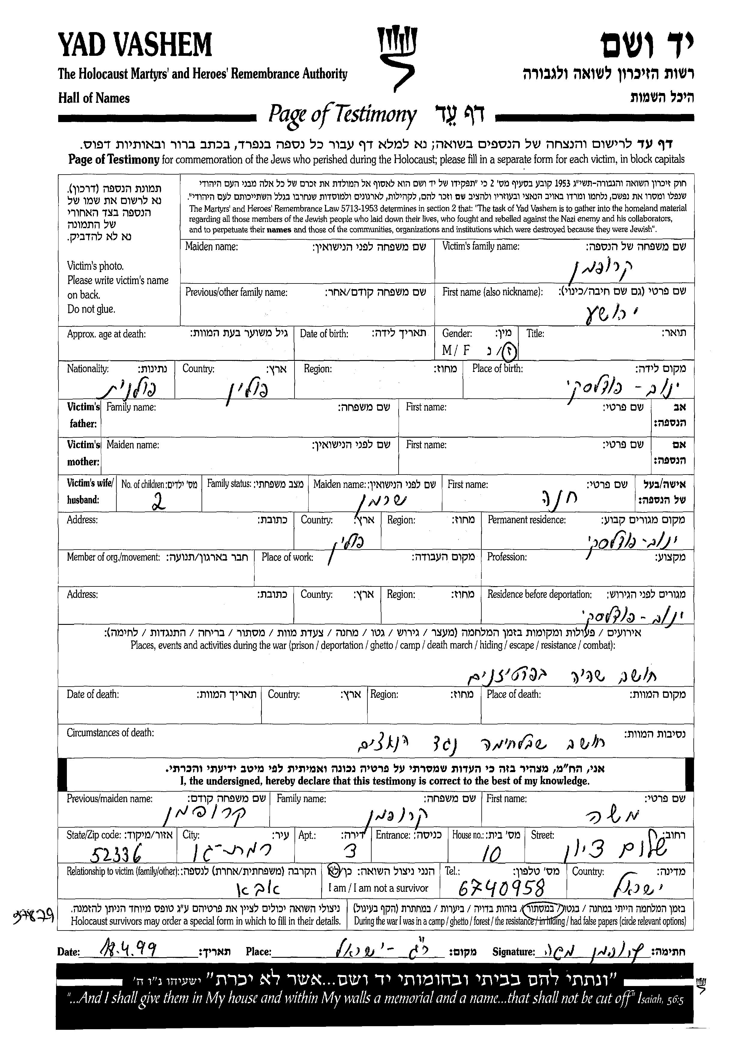 Yad Vashem - Pages of Testimony Names Memorial Collection