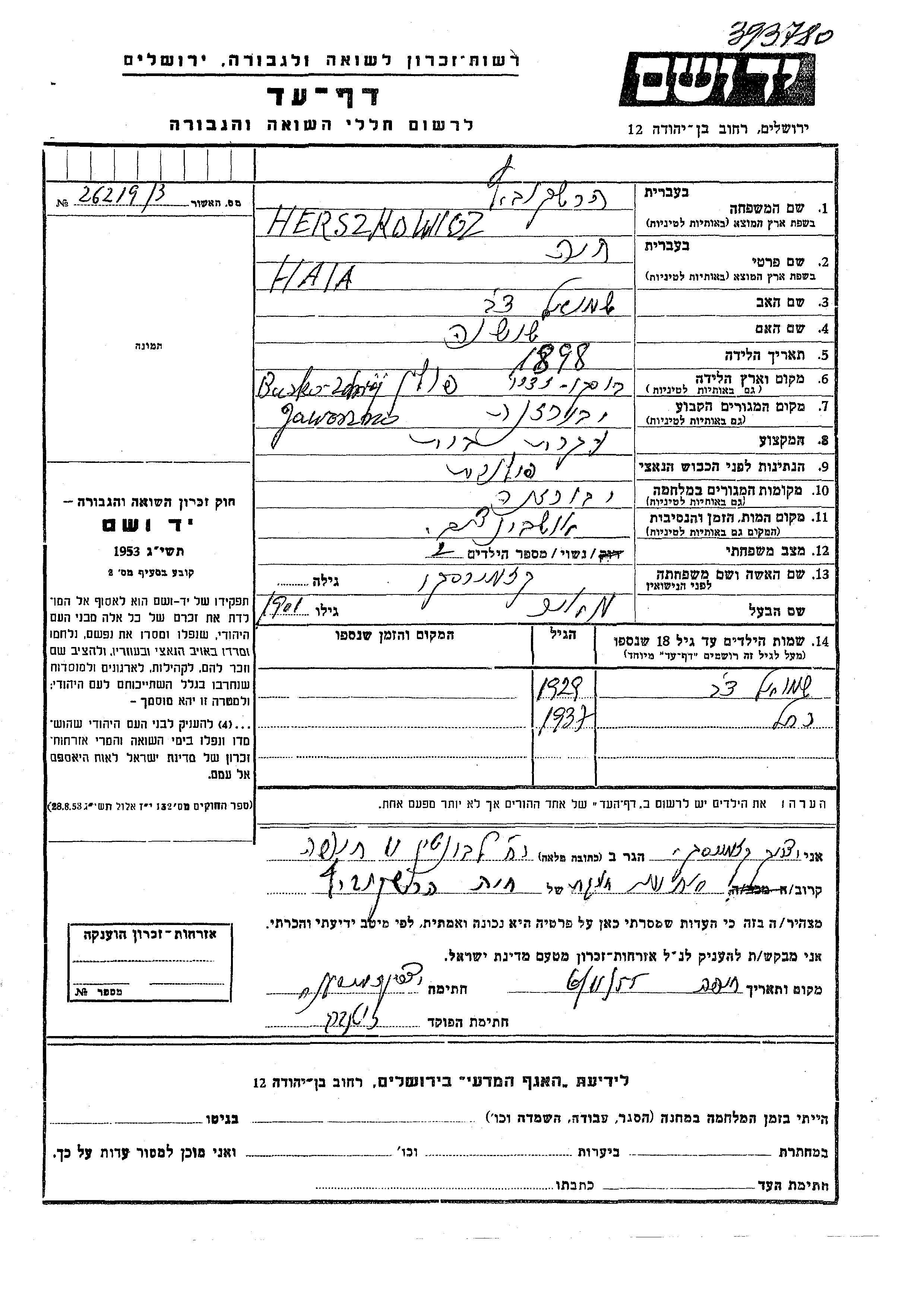Herszkowicz Shmuel Dov Jaworzna, Pologne Feuille de témoignage