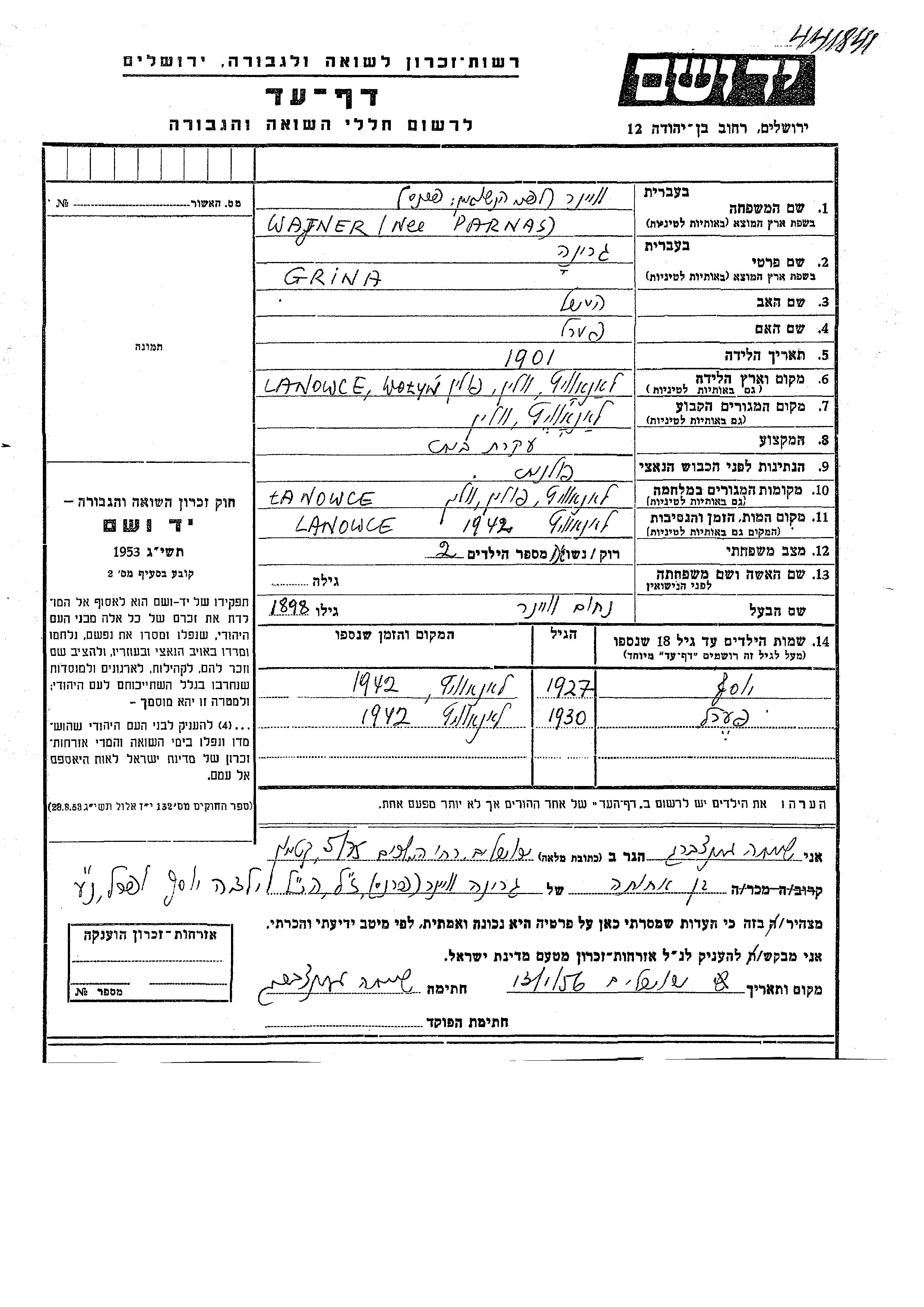 Wajner Yosef 1927 Łanowce, Pologne Feuille de témoignage