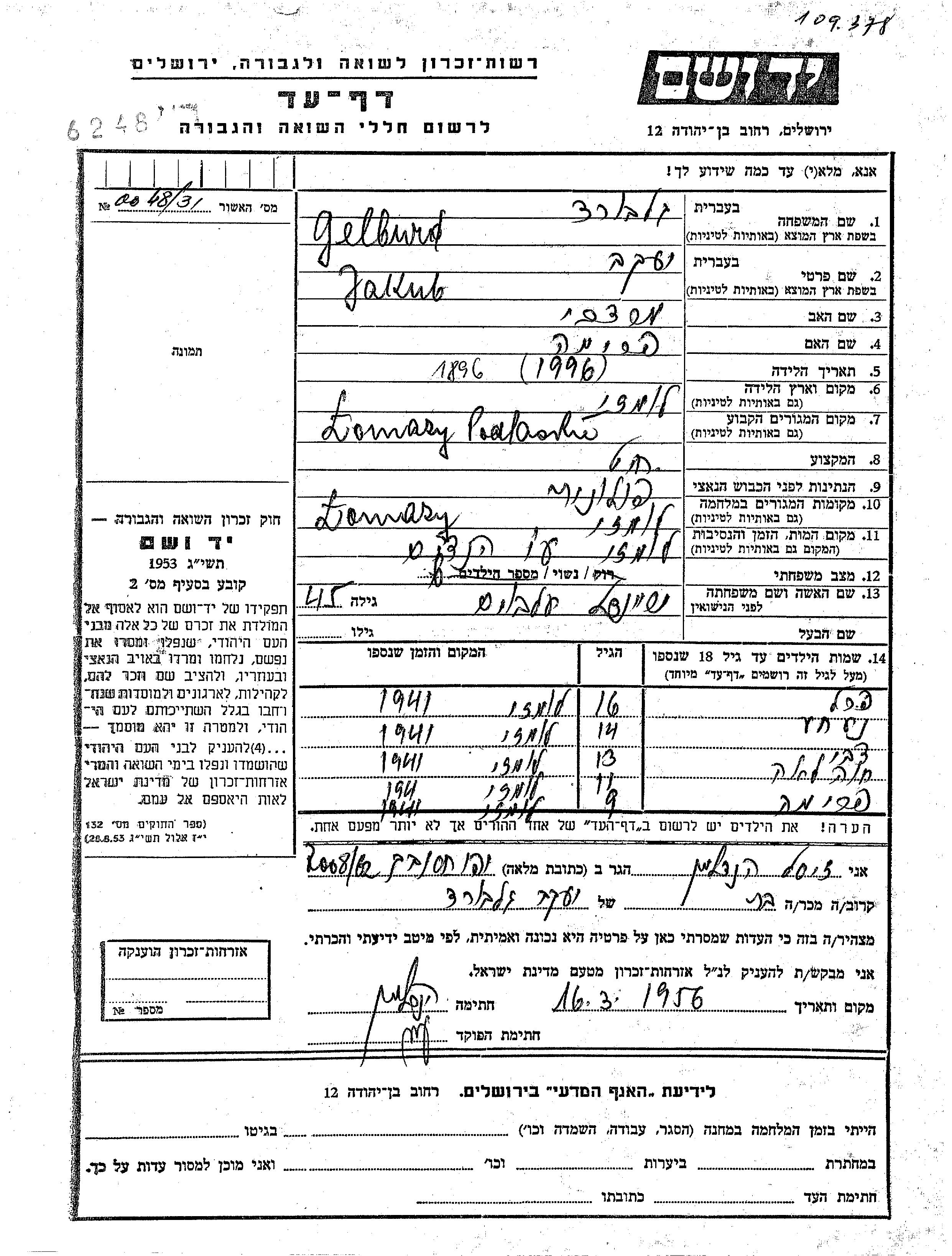 Gelburd Tzvi Lomazy, Pologne Feuille de témoignage