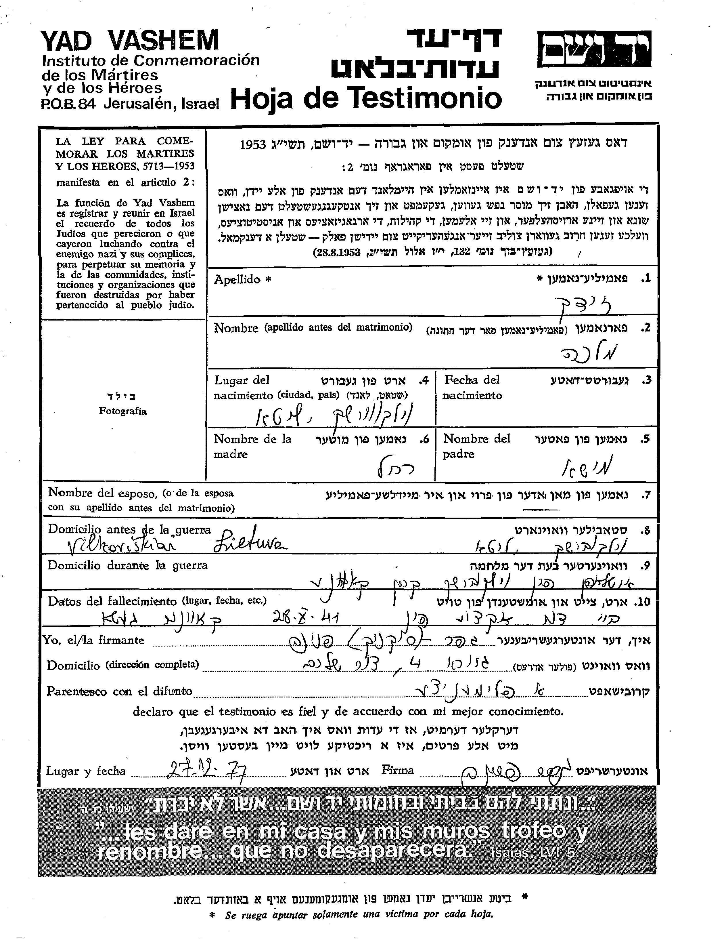 Zhidek Malka Vilkovishk, Lituanie Feuille de témoignage