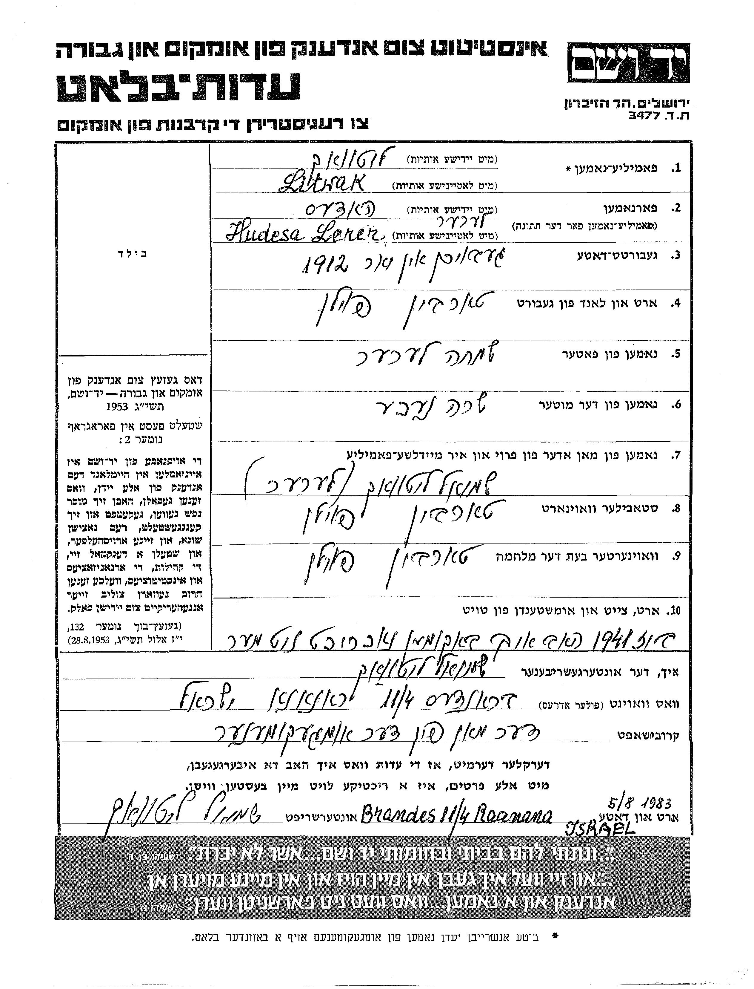 Yad Vashem - Pages of Testimony Names Memorial Collection