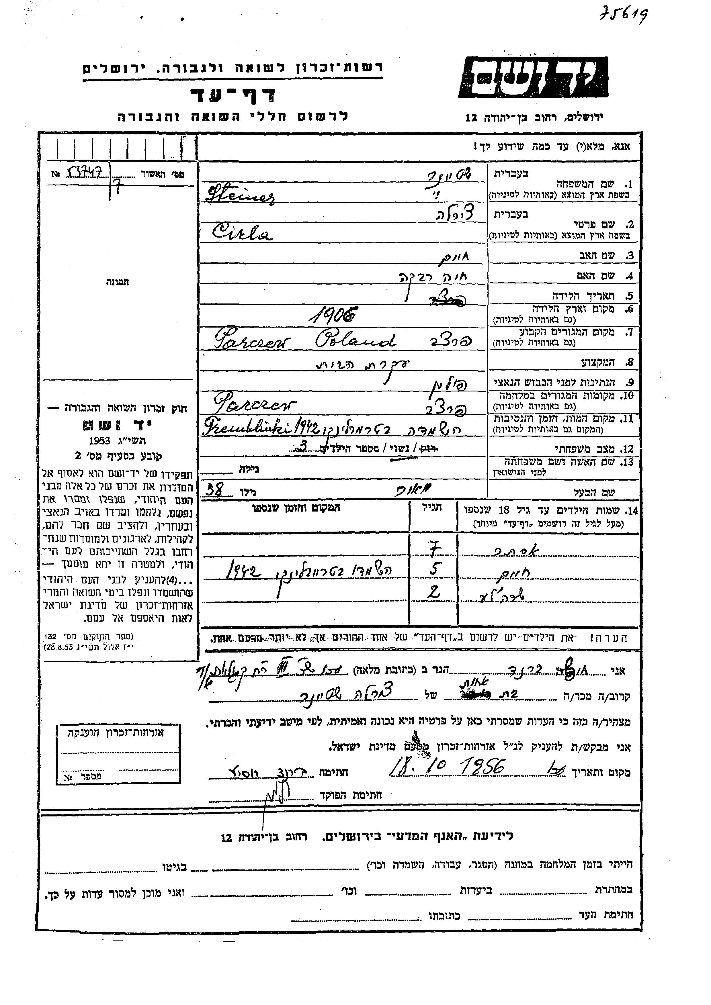 Steiner Khaim Parczew, Pologne Feuille de témoignage