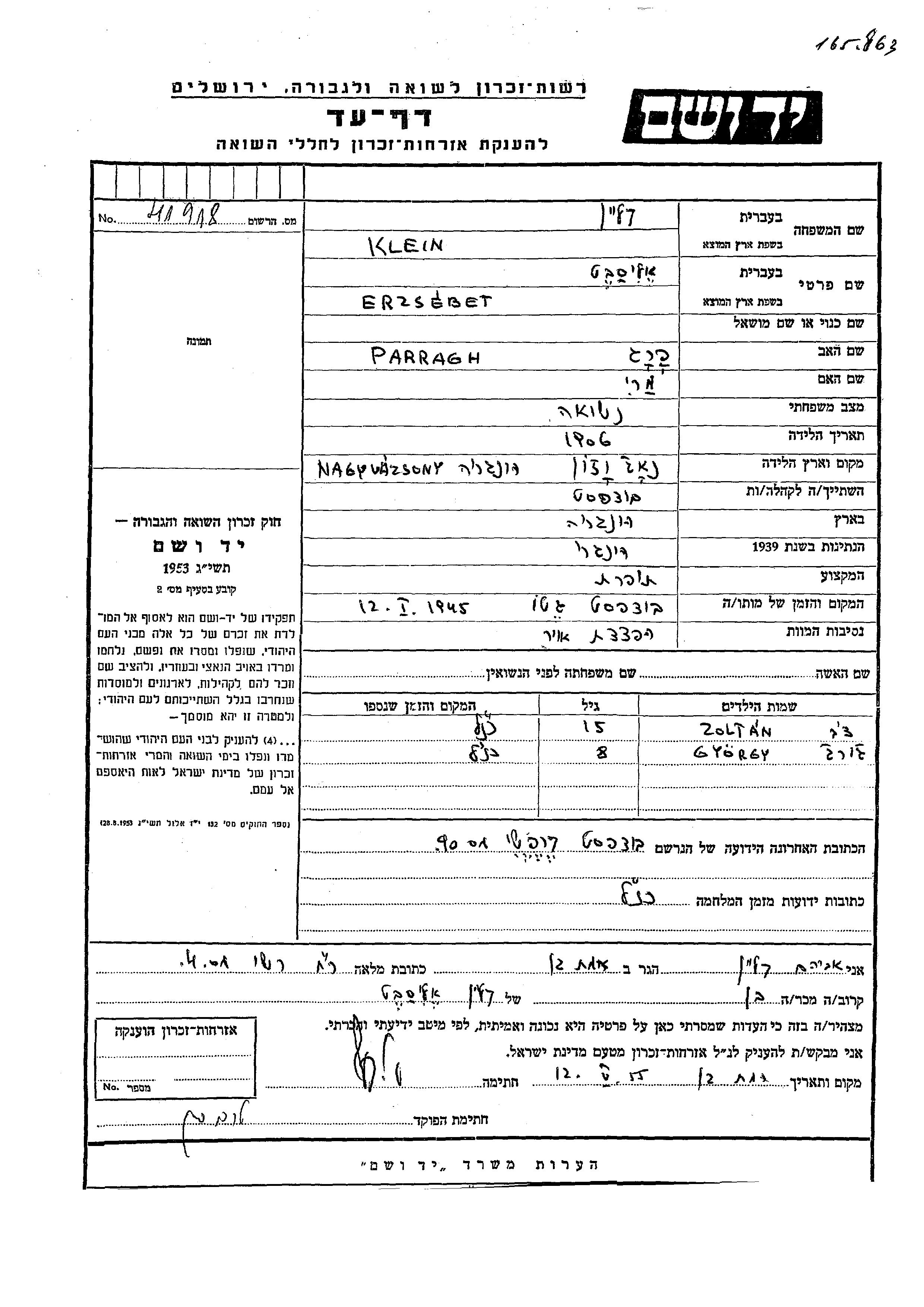 Klein Gyorgy Budapest, Hongrie Feuille de témoignage
