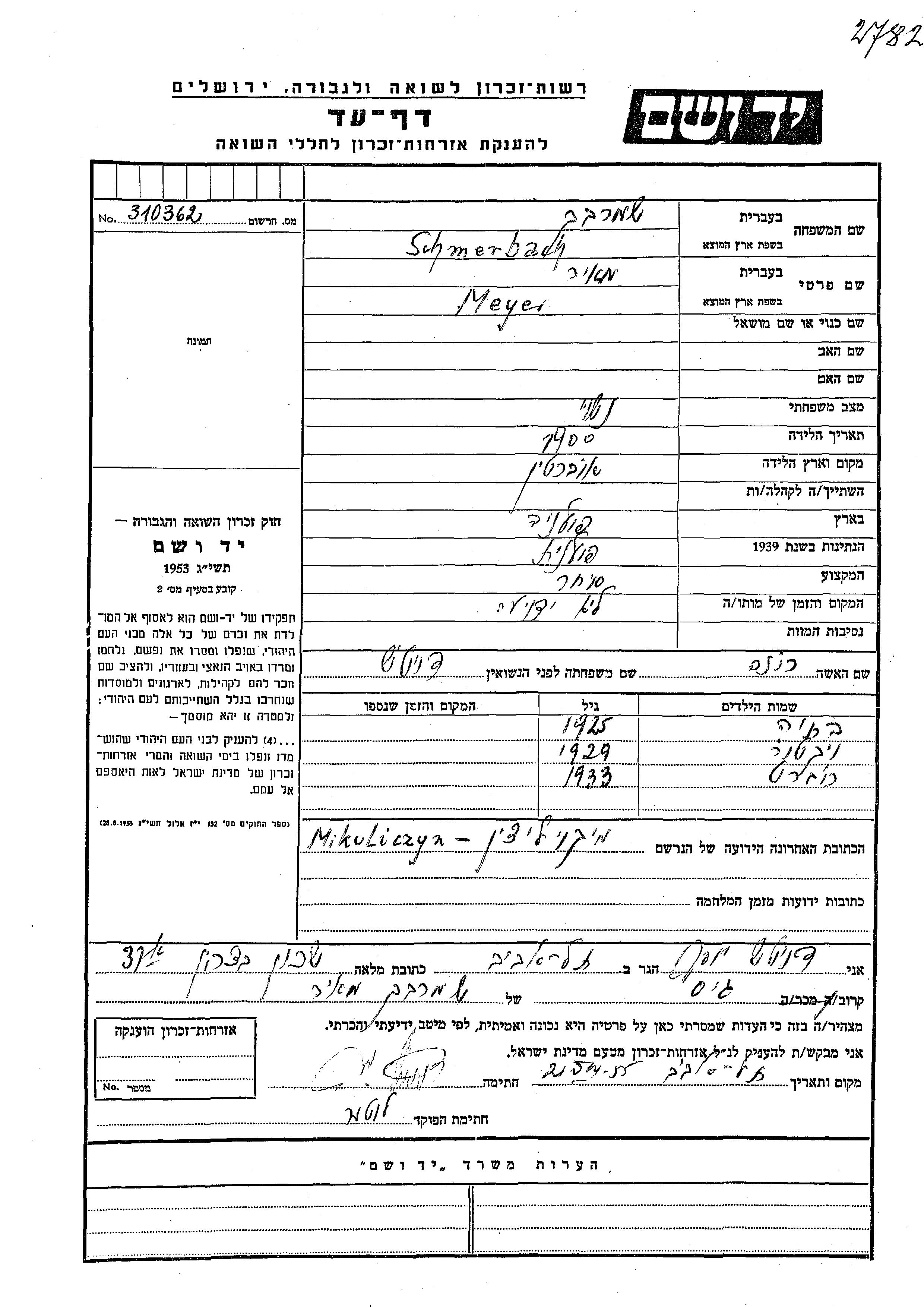 Viktor Schmerbach est né en 1929, fils de Meyer et de Roza née Deutsch. Il était Enfant. Avant la seconde guerre mondiale il vivait à Pologne. Au cours de la guerre, il était à Mikuliczyn, Pologne.