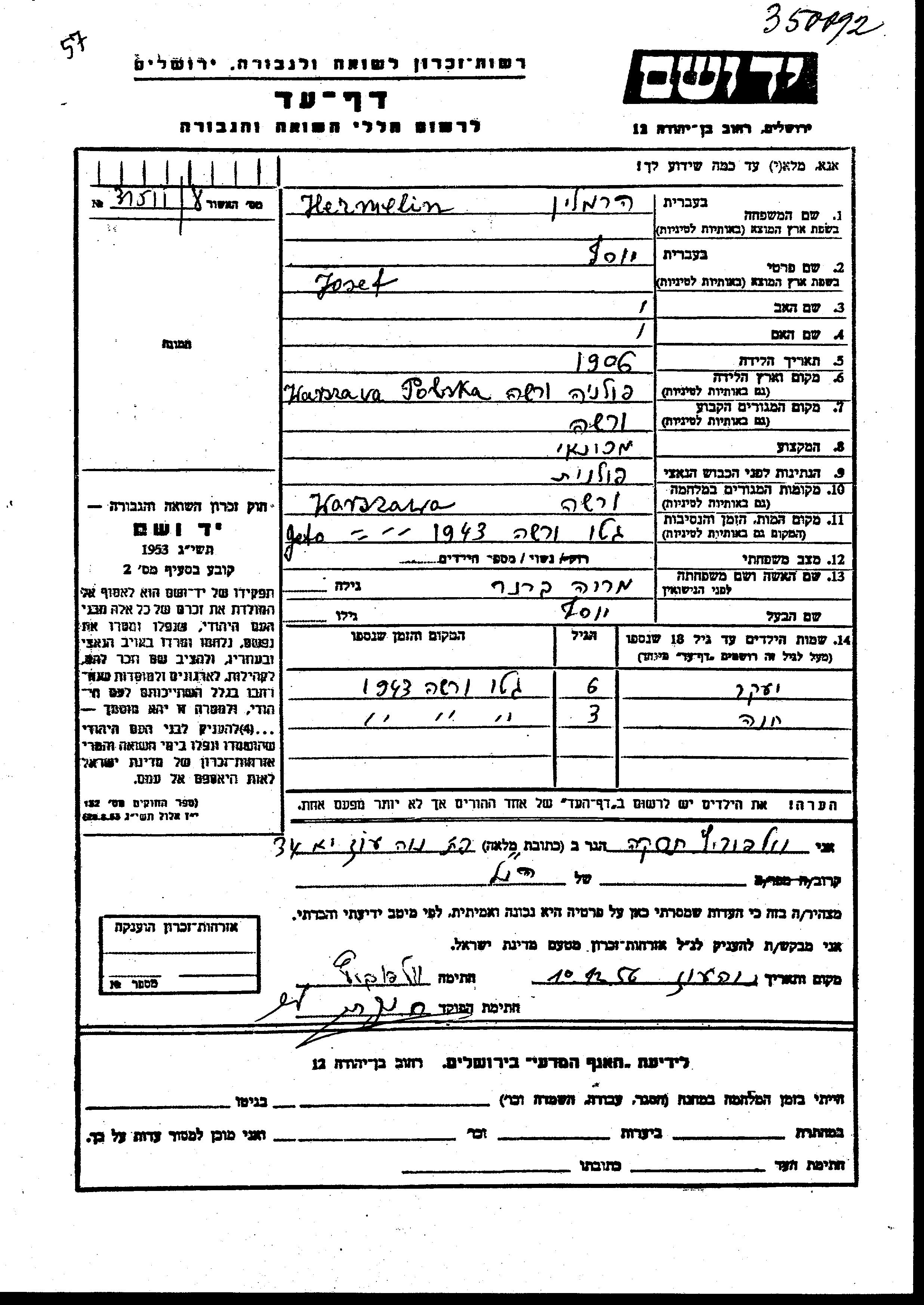 Hermelin Josef 1906 Warszawa, Pologne Feuille de témoignage