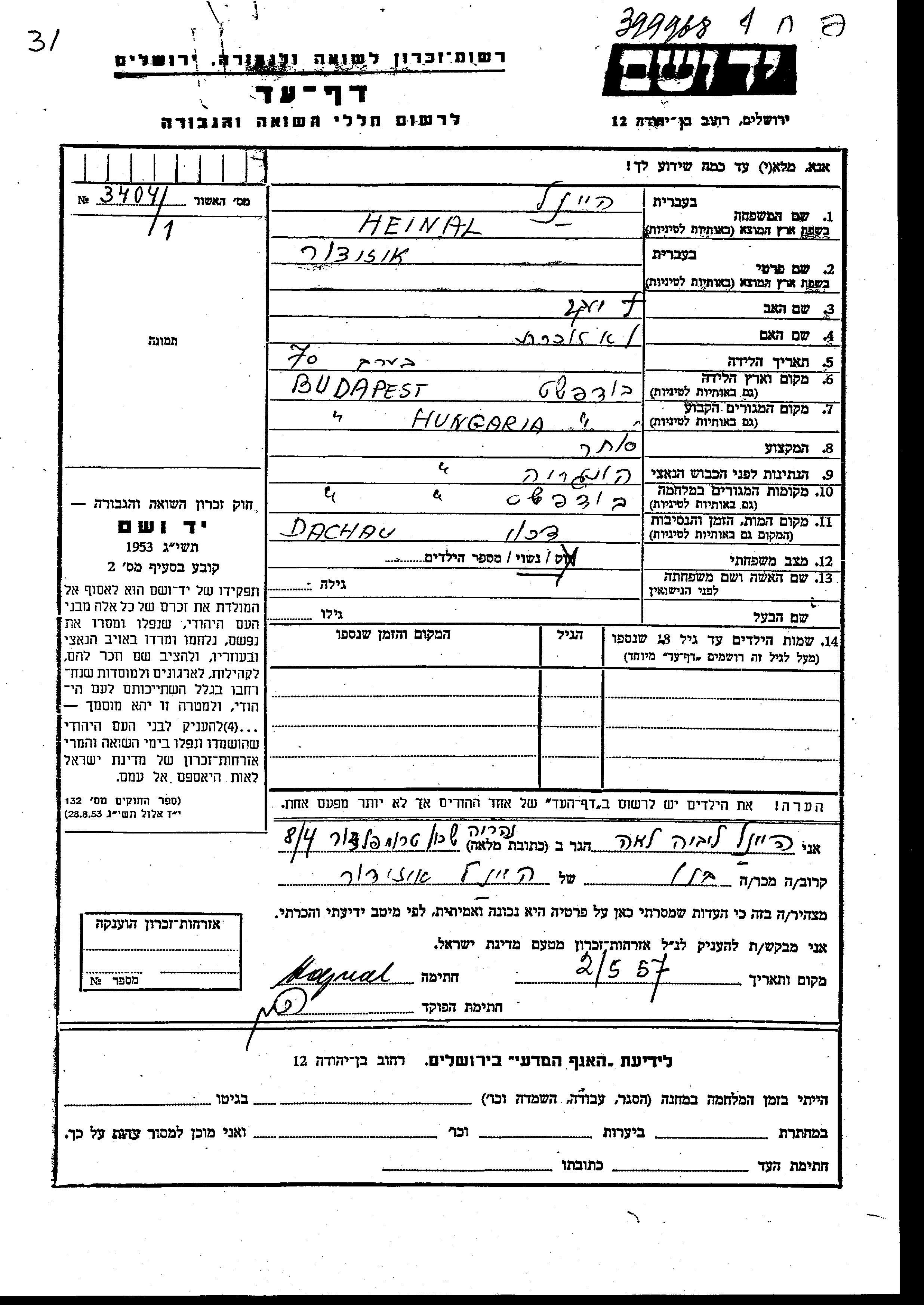 Heinal Izidor Budapest, Hongrie Feuille de témoignage
