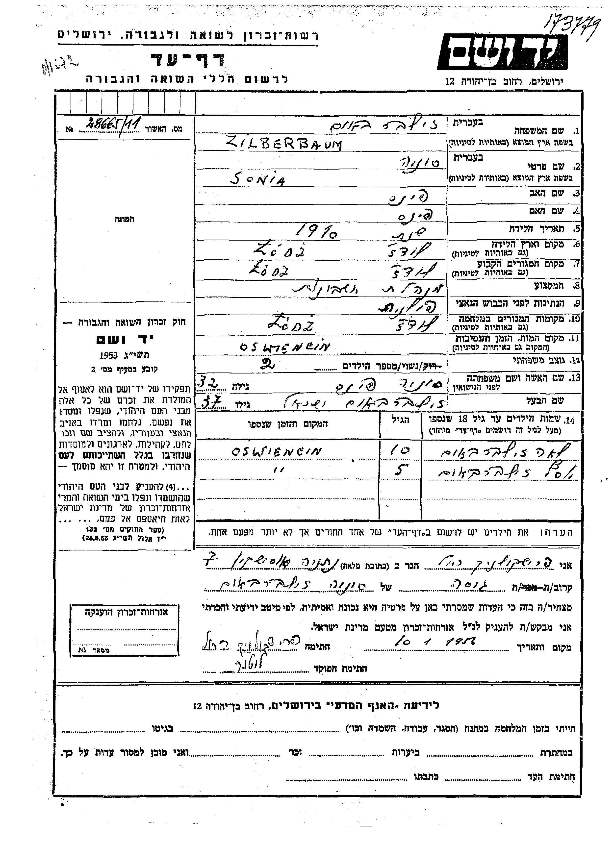 Zilberbaum Yosef Lodz, Pologne Feuille de témoignage