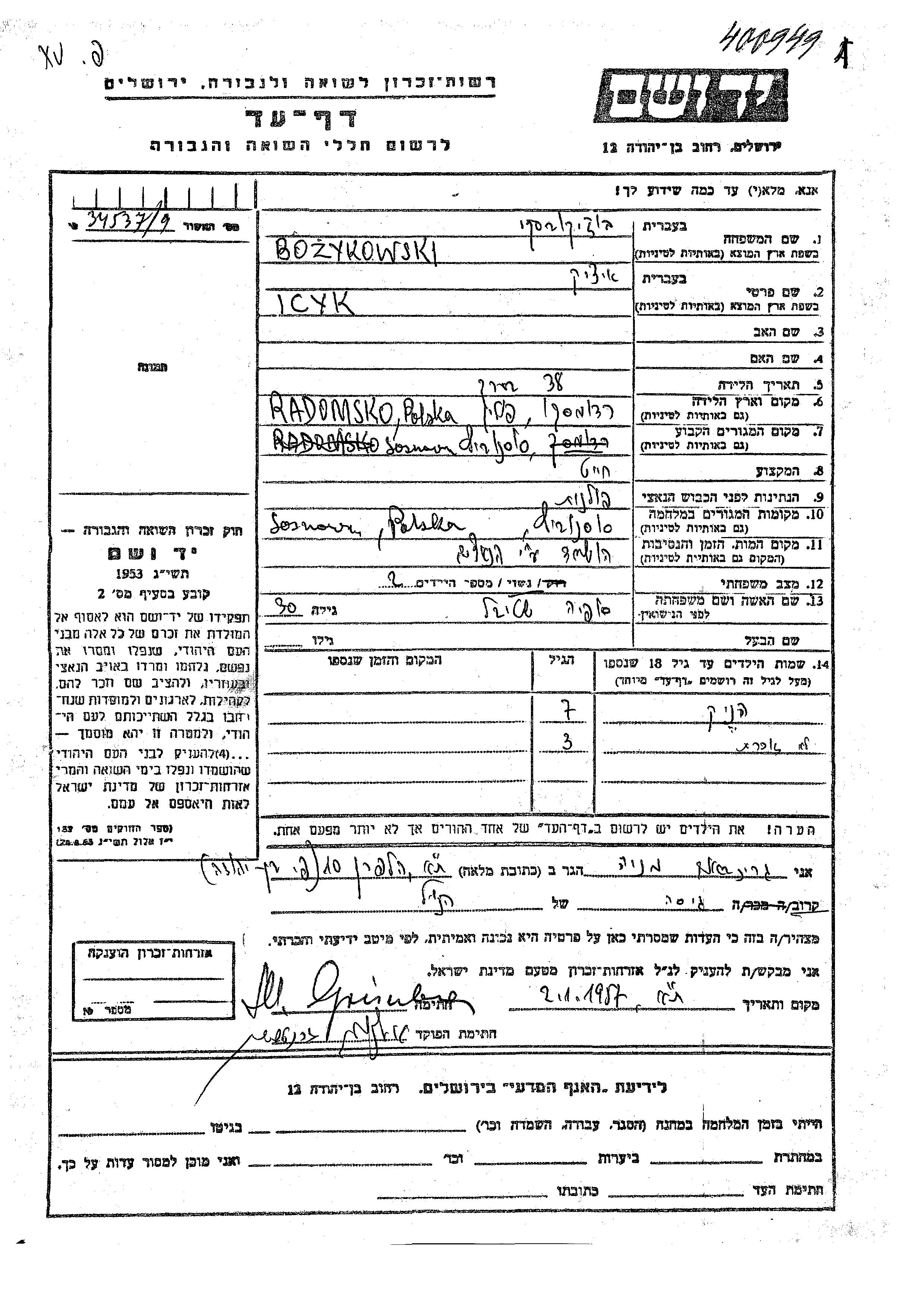 Bozykowski Heniek Sosnowiec, Pologne Feuille de témoignage