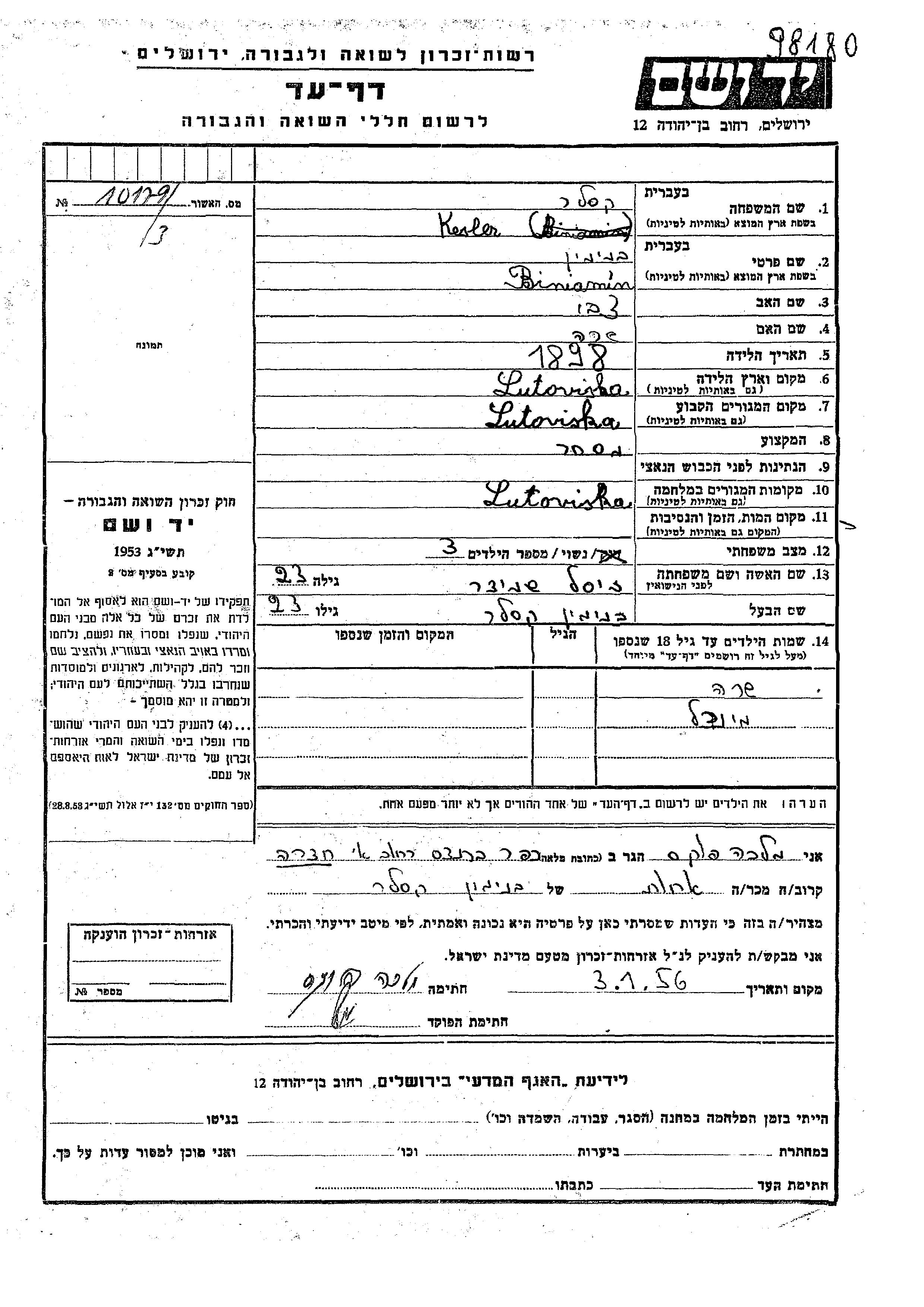 Kesler Sara Lutoviska, Pologne Feuille de témoignage