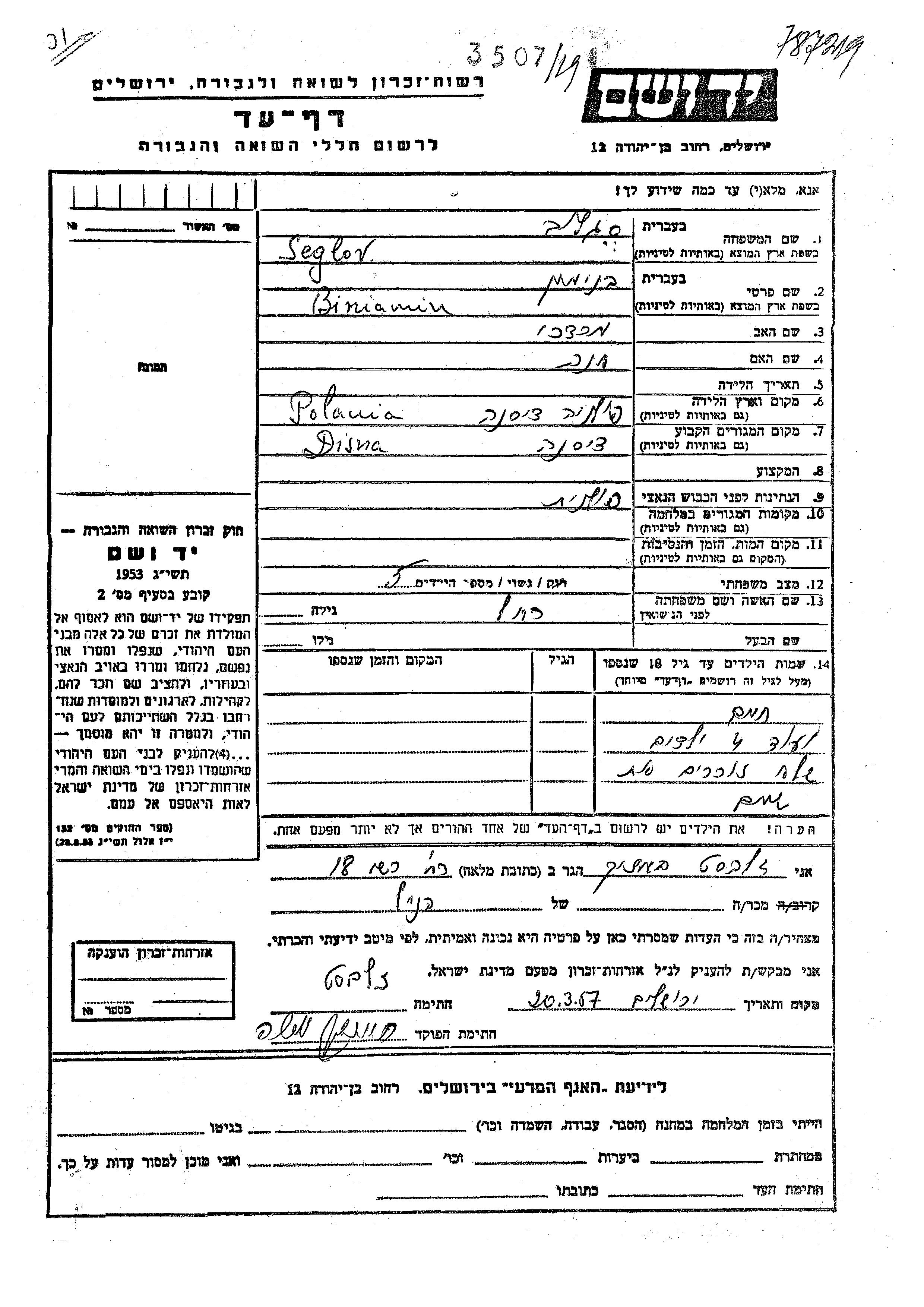 Seglov Khaim Disna, Pologne Feuille de témoignage