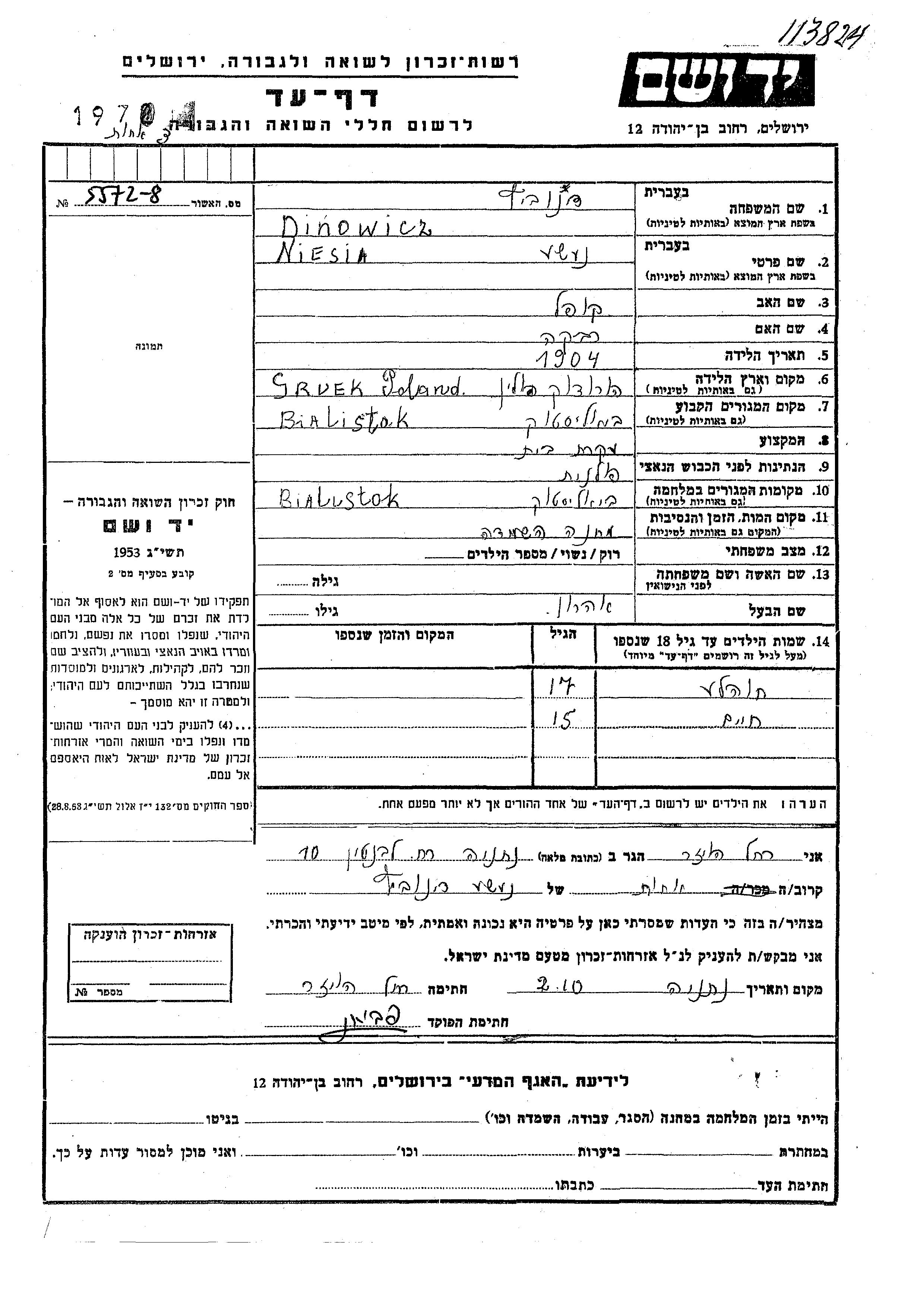 Dinowicz Khaim Bialystok, Pologne Feuille de témoignage