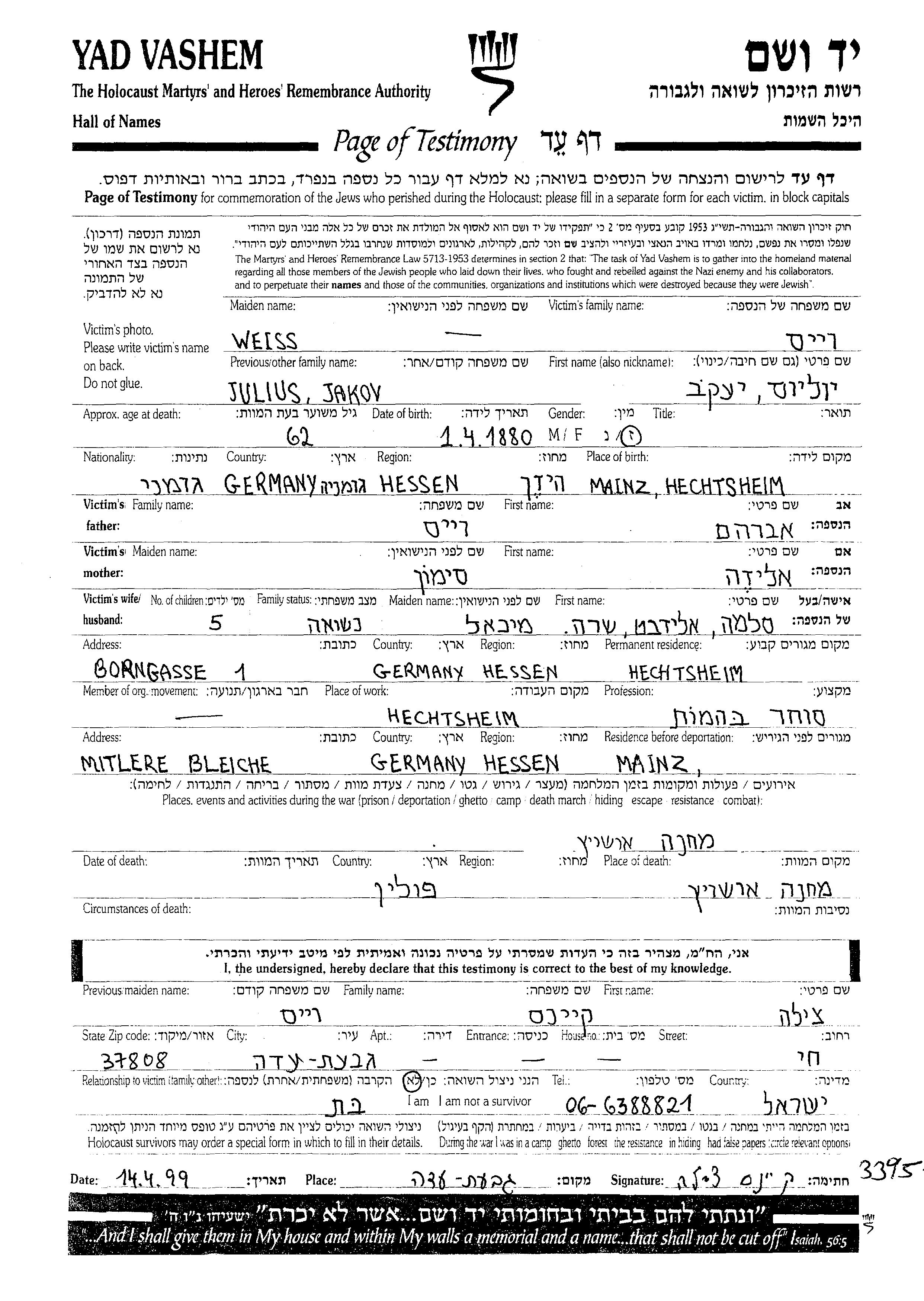 Julius Jakov Weiss est né à Hechtsheim, Allemagne en 1880, fils de Avraham et de Eliza. Il était Négociant en bétail et Mariée à Selma Elizabet née Mikhael. Avant la seconde guerre mondiale il vivait à Hechtsheim, Allemagne. Au cours de la guerre, il était à Mainz, Allemagne.