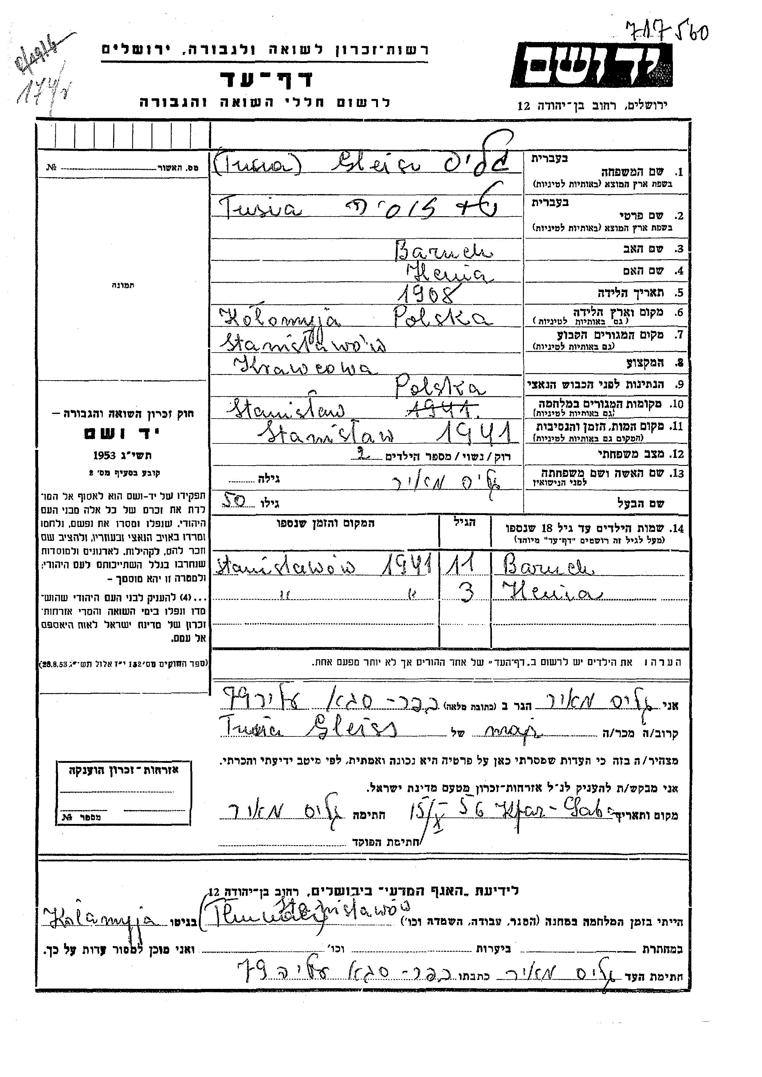 Gleis Gelis Henia Stanislawow, Pologne Feuille de témoignage