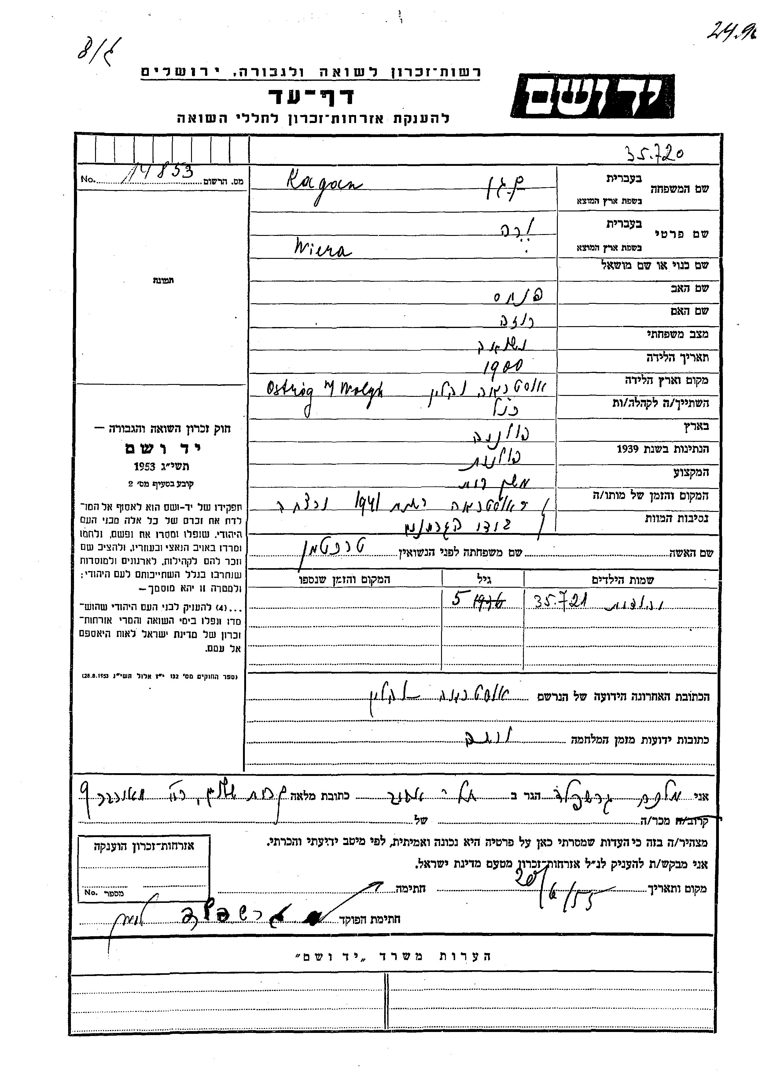 Kagan Yehudit Ostra, Pologne Feuille de témoignage