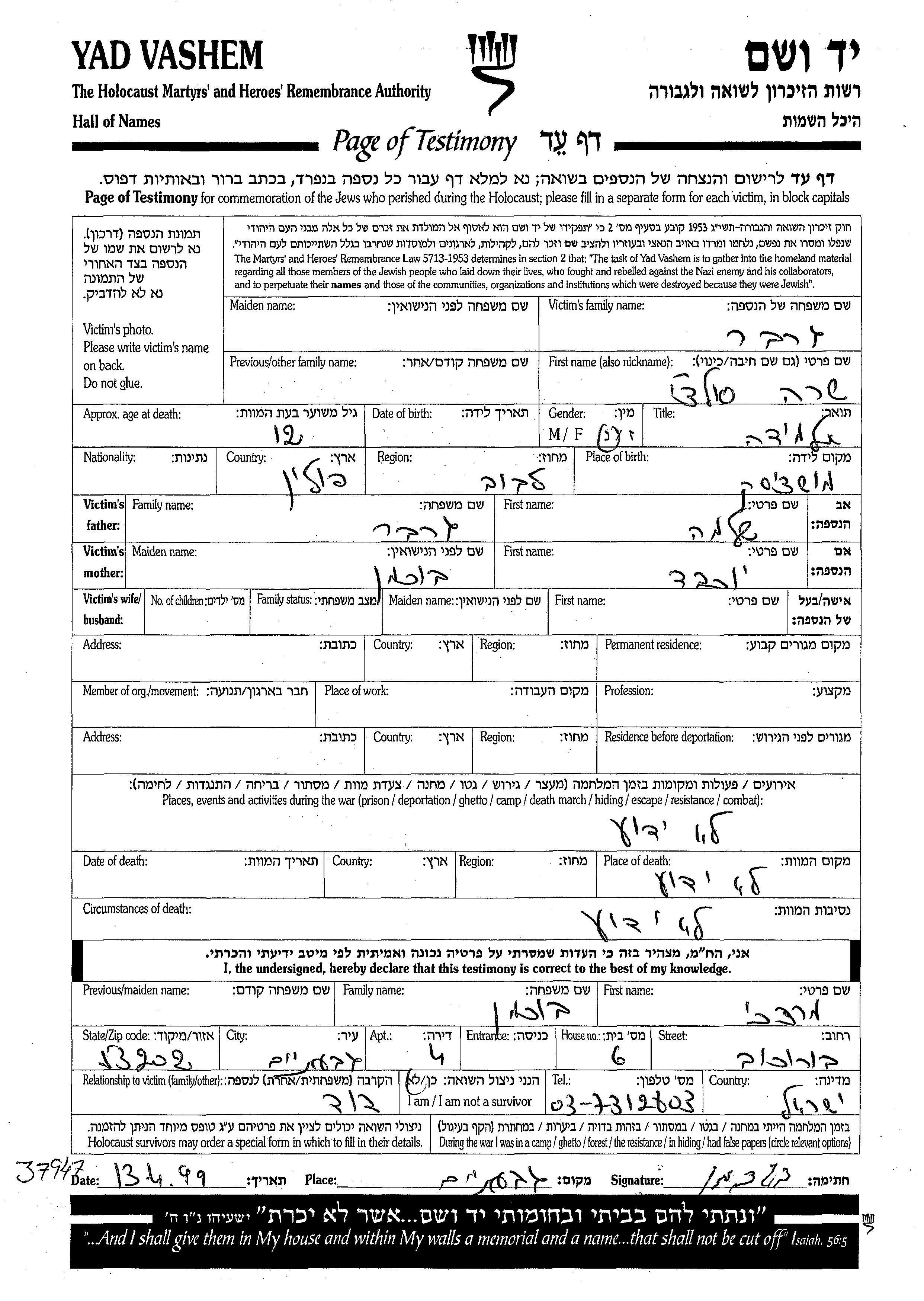 Yad Vashem - Pages of Testimony Names Memorial Collection