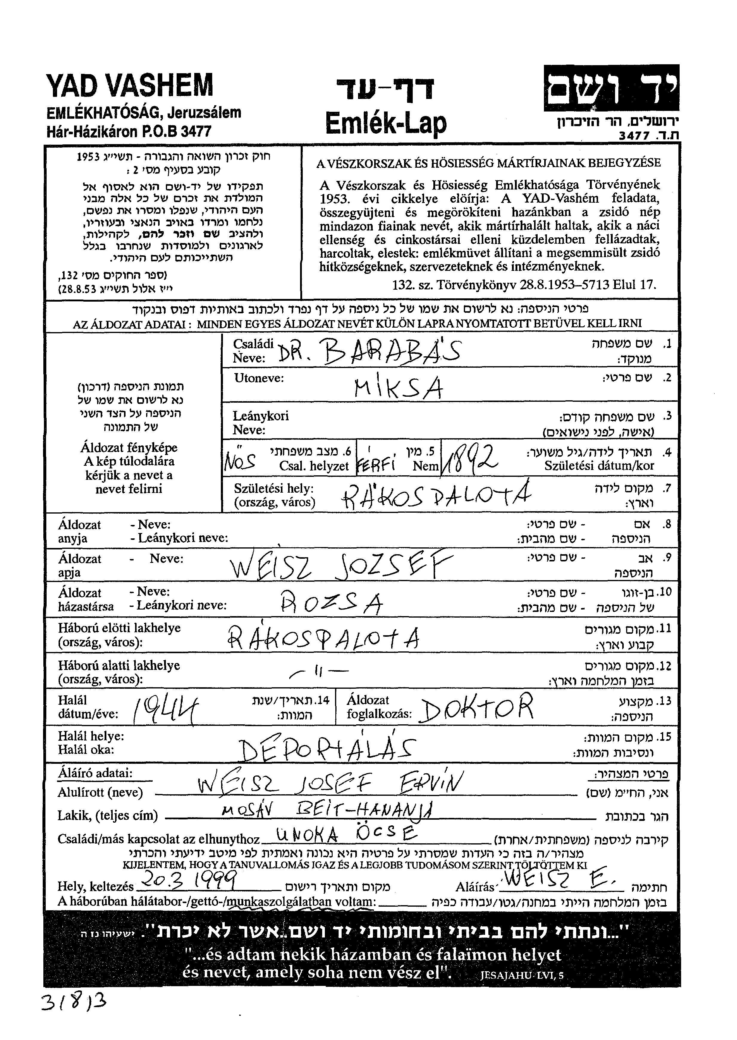 Miksa Barabas est né à Rakospalota, Hongrie en 1892, fils de Jozsef et de Rozsa. Il était Médecin et Marié. Avant la seconde guerre mondiale il vivait à Rakospalota, Hongrie. Au cours de la guerre, il était à Rakospalota, Hongrie.