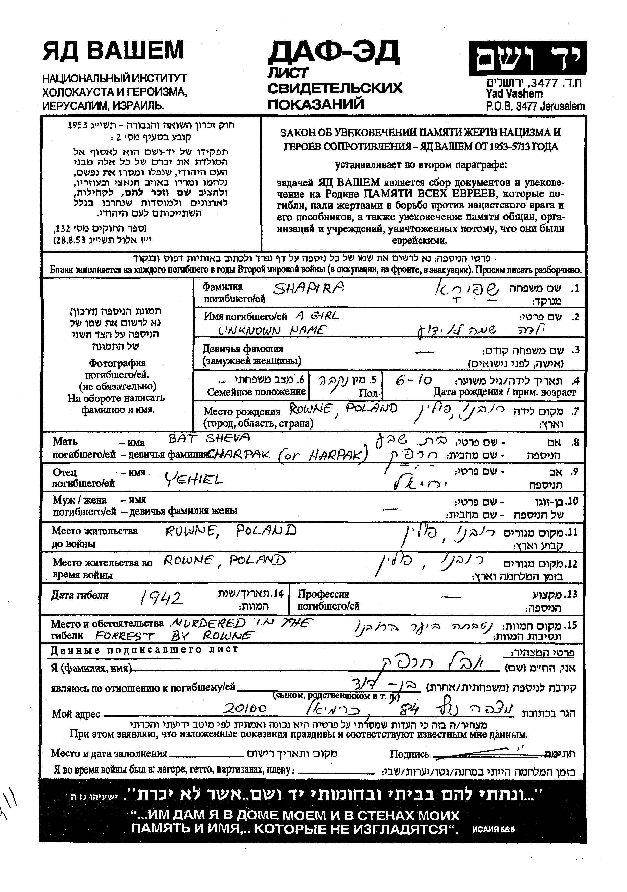 Shapira prénom inconnu Rowne, Pologne Feuille de témoignage