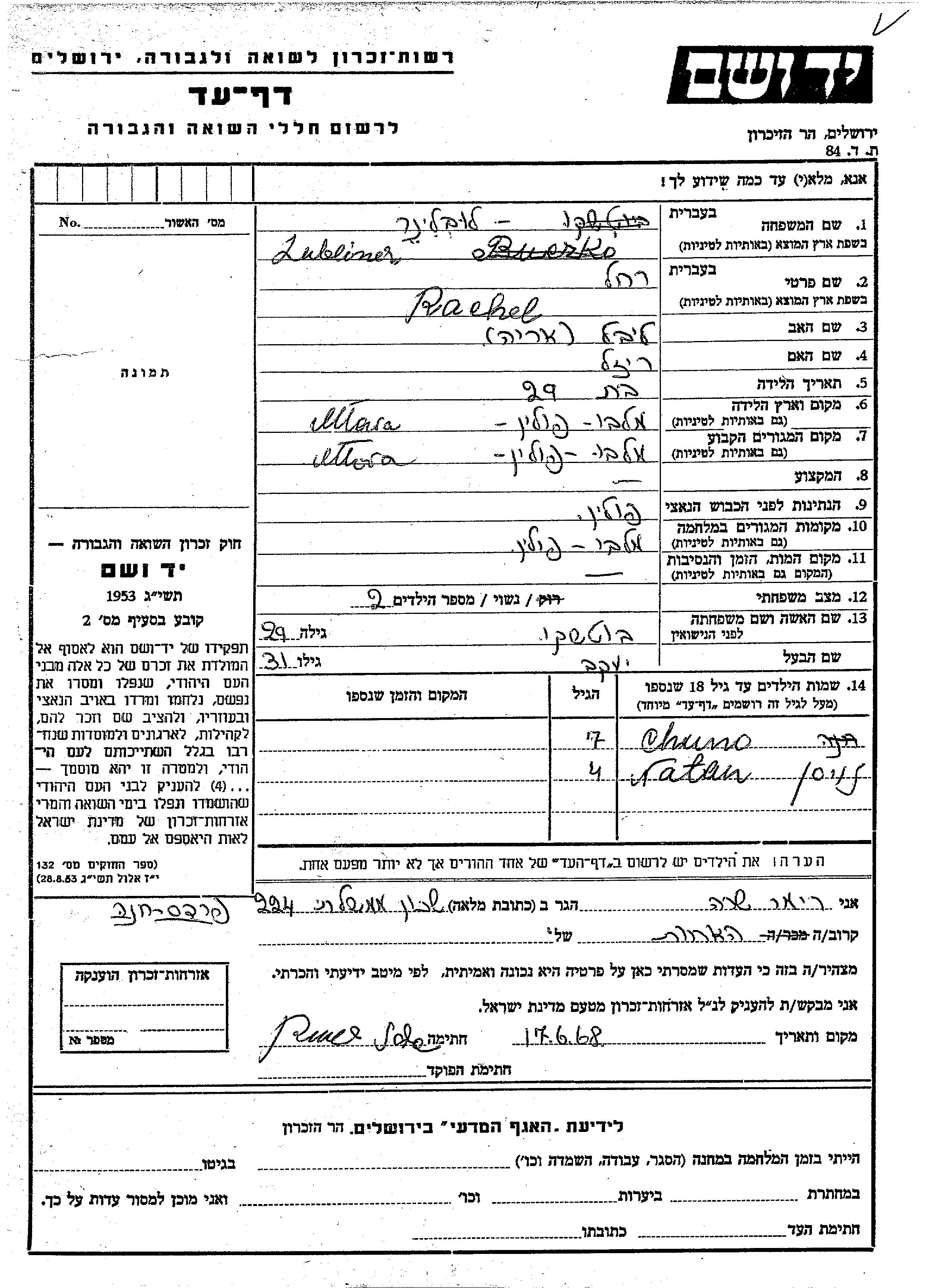 Lubliner Chuno Khana Mlawa, Pologne Feuille de témoignage