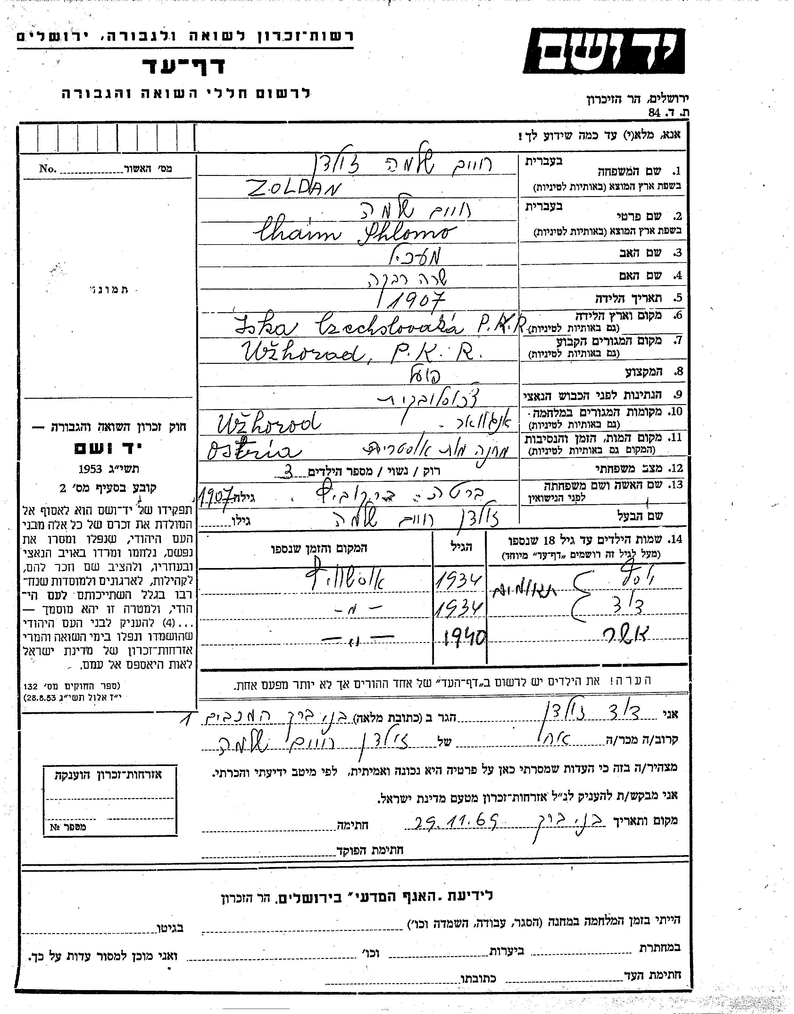 Zoldan Asher 1940 Uzhorod, Tchécoslovaquie Feuille de témoignage