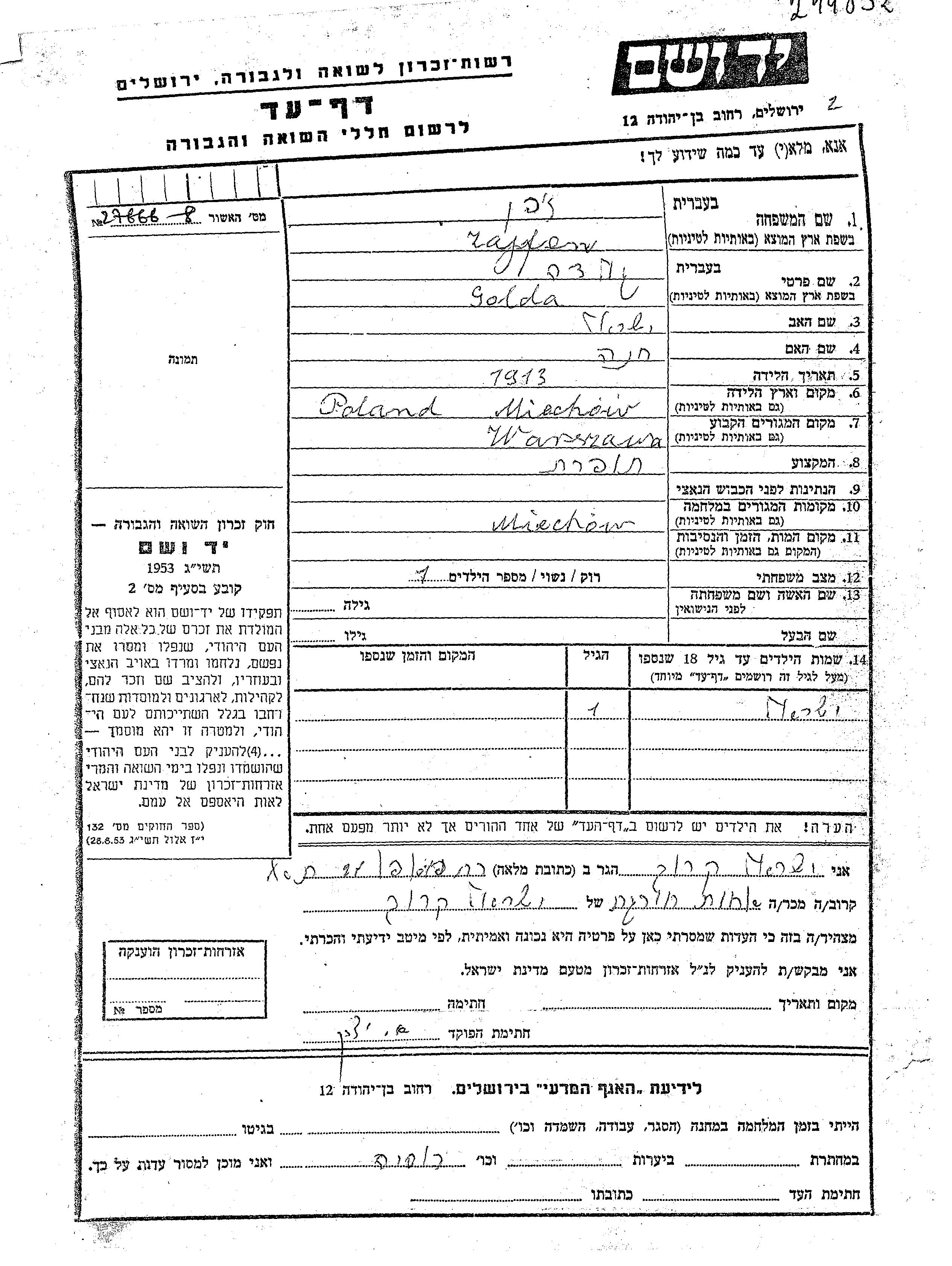 Yisrael Zayfen est né fils de Golda. Il était Enfant. Avant la seconde guerre mondiale il vivait à Warsaw, Pologne. Au cours de la guerre, il était à Miechów, Pologne.